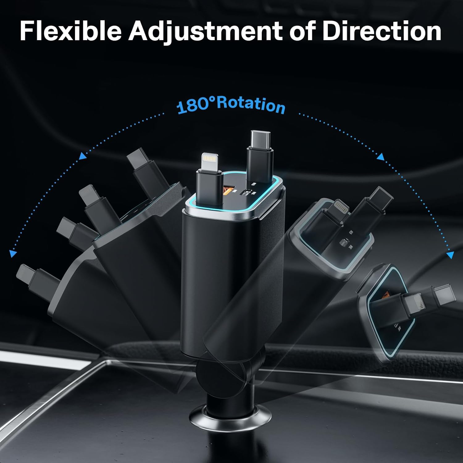 - ă131W 4-in-1 Super Fast Car ChargerăThis 4-in-1 retractable car charger features USB-C, USB-A, and dual built-in retractable cables (Type-C & iOS), delivering ultra-fast charging for up to four devices at once without power drop. Perfect for road trips, carpooling, rideshare drivers, and truckers who need reliable, all-day power on the go.
