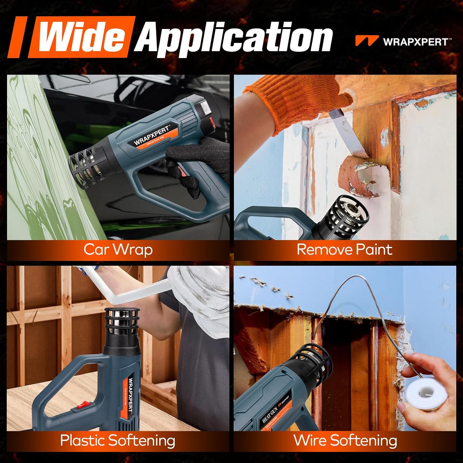 - Powerful 2000W Heating – Heats up fast with 2000W of power; adjustable temperature range from 120°F–1202°F (50°C–650°C), suitable for vinyl wrap, shrinking, paint removal, and more
