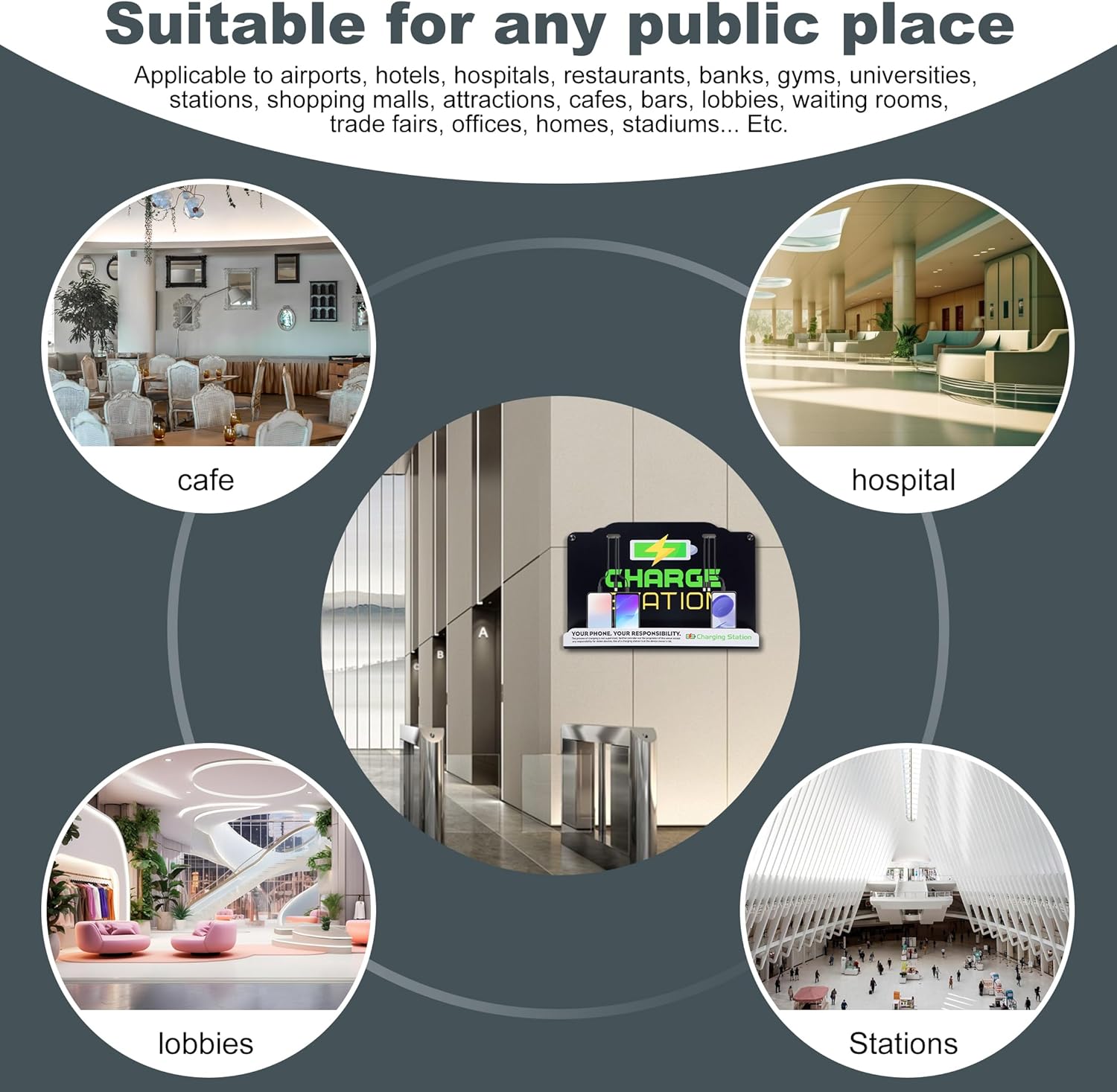- Application: the wall mounted charging station will be suitable for airport, hotel, restaurants, banks, shopping malls, lobbies, waiting rooms, trade shows, universities, classroom, stadiums, retail, corporate offices, home, etc.