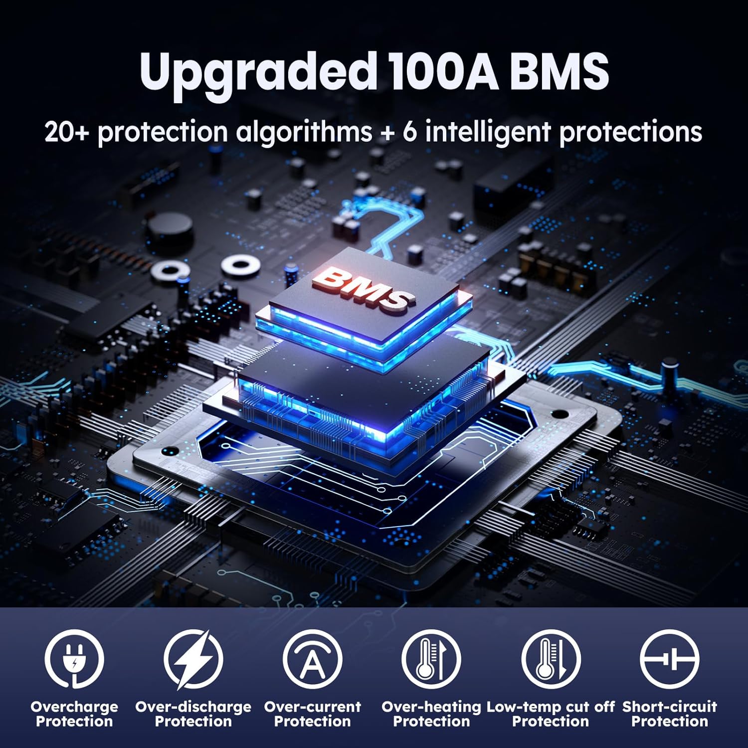 - ✅Enhanced Safety with BMS Protection: Equipped with a BMS (Battery Management System) protection board, our 12.8V 100Ah TM battery offers 100% safety assurance. The 100A BMS provides multiple protections against overcharging, over-discharging, over-current, short circuit, low-temperature, and high-temperature situations. You can trust that your battery and devices are safe and secure