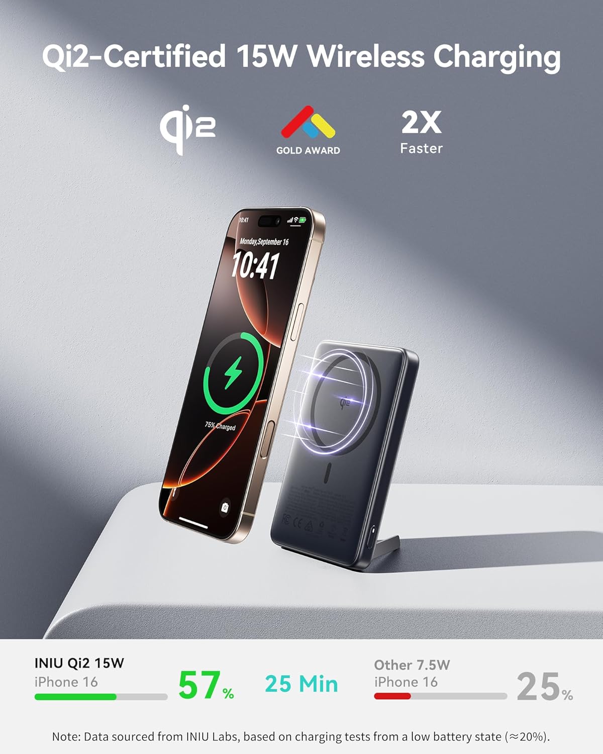 - Latest Qi2-Certified 15W Wireless Charging: Solving the industry's slow wireless magnetic charging issue, this portable charger powers your iPhone 16 up to 39% in just 25min — 2X faster than other 7.5W chargers.