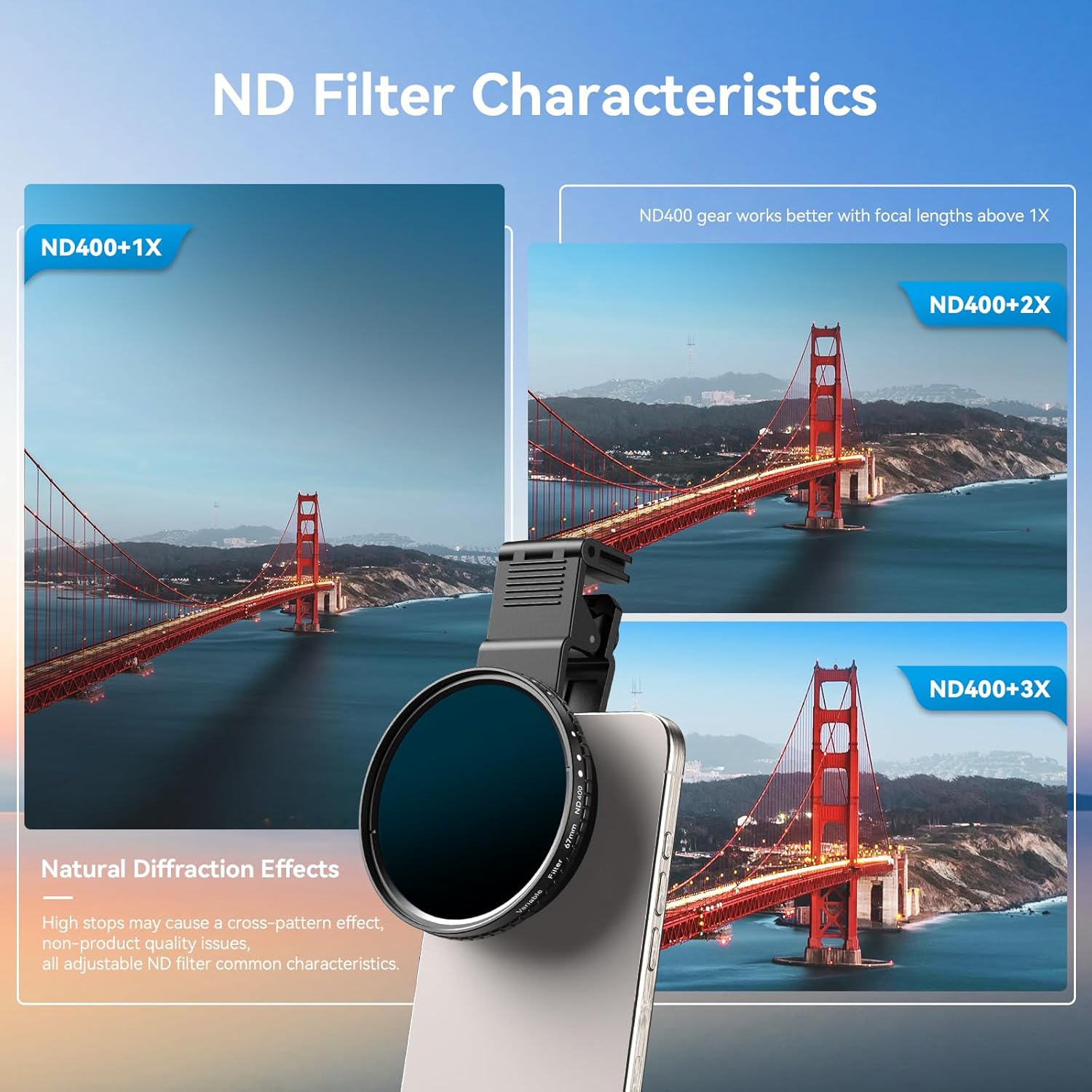 - Whatโs Included: The package includes 1 x 67mm VND 2-400 Filter, 1 x Phone Clip, 1 x Storage Case, and 1 x Cleaning Cloth โ all the essential tools for professional-quality mobile photography and easy storage