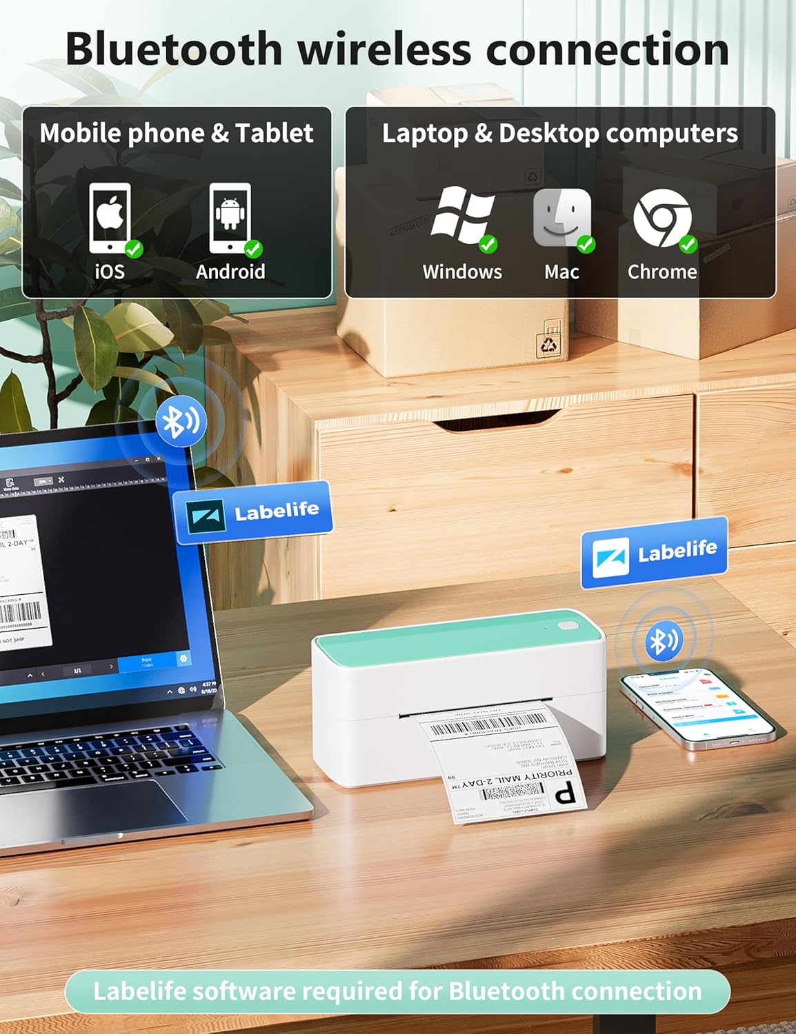 - [Print Via Bluetooth] - Phomemo bluetooth shipping label printer supports wireless printing through bluetooth connection. For IOS and Android mobile Phone, need to download the "labelife " APP from Apple Store or Google Play. With easy and simple operations, you can easily print your logo, labels, and more, making your life more convenient! Note: All devices cannot be directly connected to Bluetooth and need to be used through the app