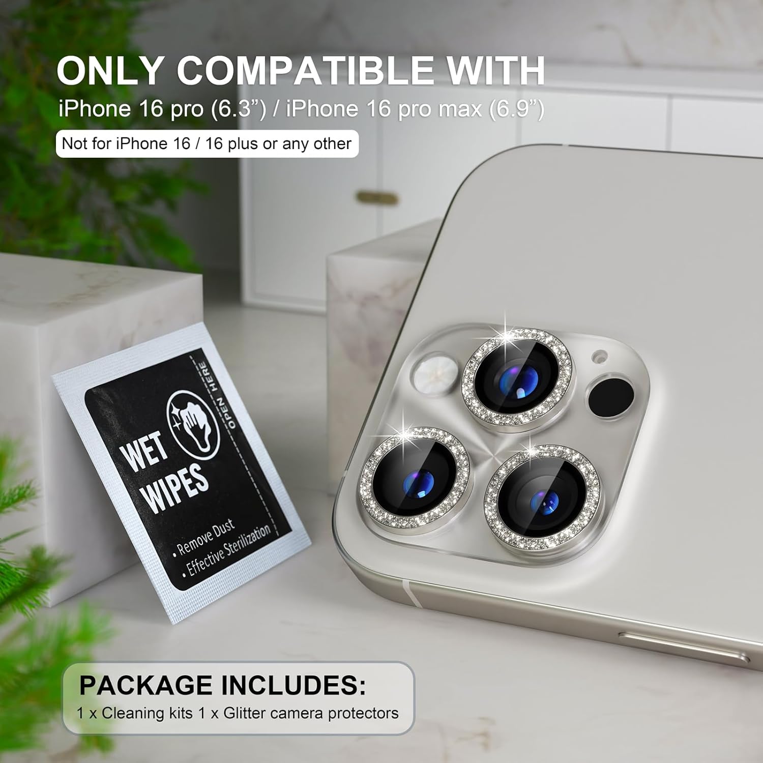 - Bling Camera Lens Protector: We present new upgrade smartphone rear camera lens Protectors which are perfectly compatible for iPhone 16 Pro Max 6.9-inch & iPhone 16 Pro 6.3-inch 2024 released. The package contains a set of delicate camera lens protectors and a set of cleaning kits. Please confirm the iPhone models carefully before purchase.