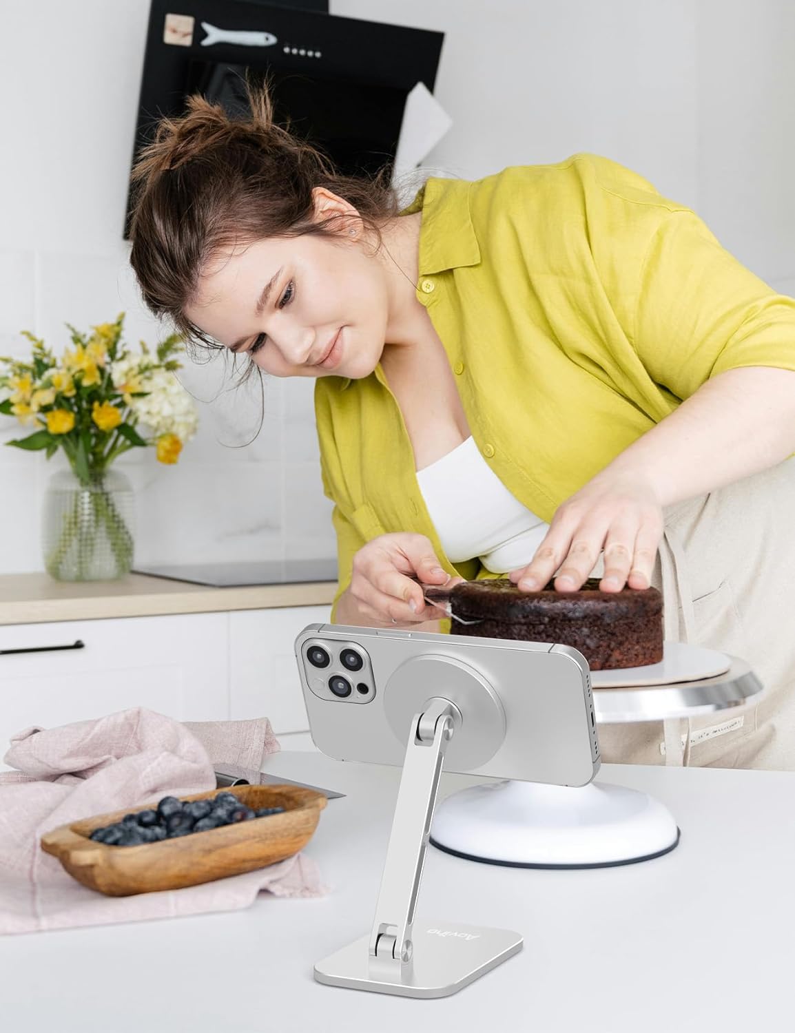 - 【Sturdy and Stable】: Made from premium aluminum, this magsafe cell phone holder offers sleek durability. The reinforced base with non-slip silicone ensures your phone stays secure, even on slippery surfaces. No more wobbles or slips—use it with confidence anywhere