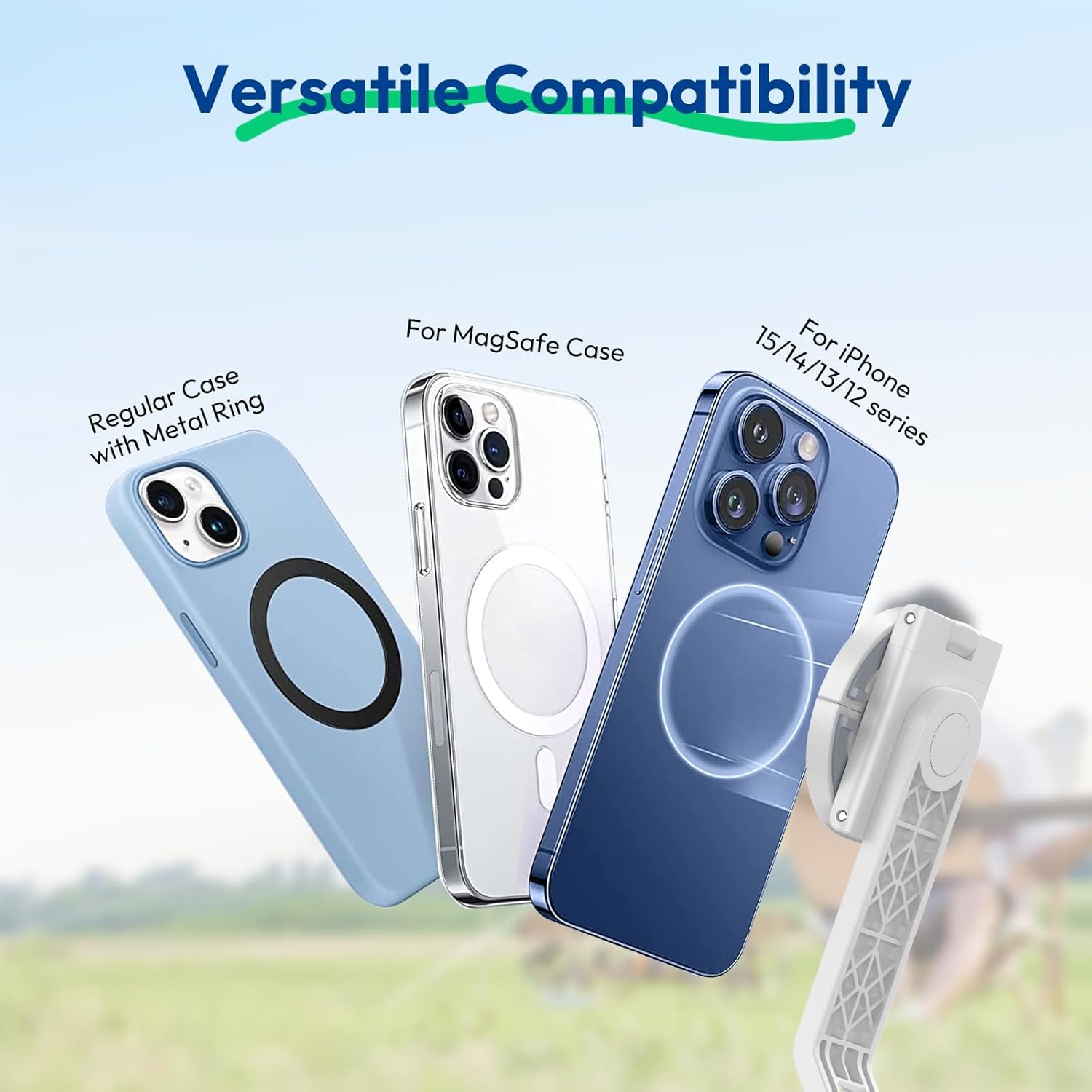 - ăAll-in-One Magnetic Universal Designă Designed with an upgraded integrated structure, this tripod for iphone offers quick magnetic attachment for iPhone 15/14/13/12 series and MagSafe cases. The adjustable top clip doubles as a universal phone holder, with a 2.2-2.36-inch clamping range, accommodating most non-magnetic smartphones with ease.