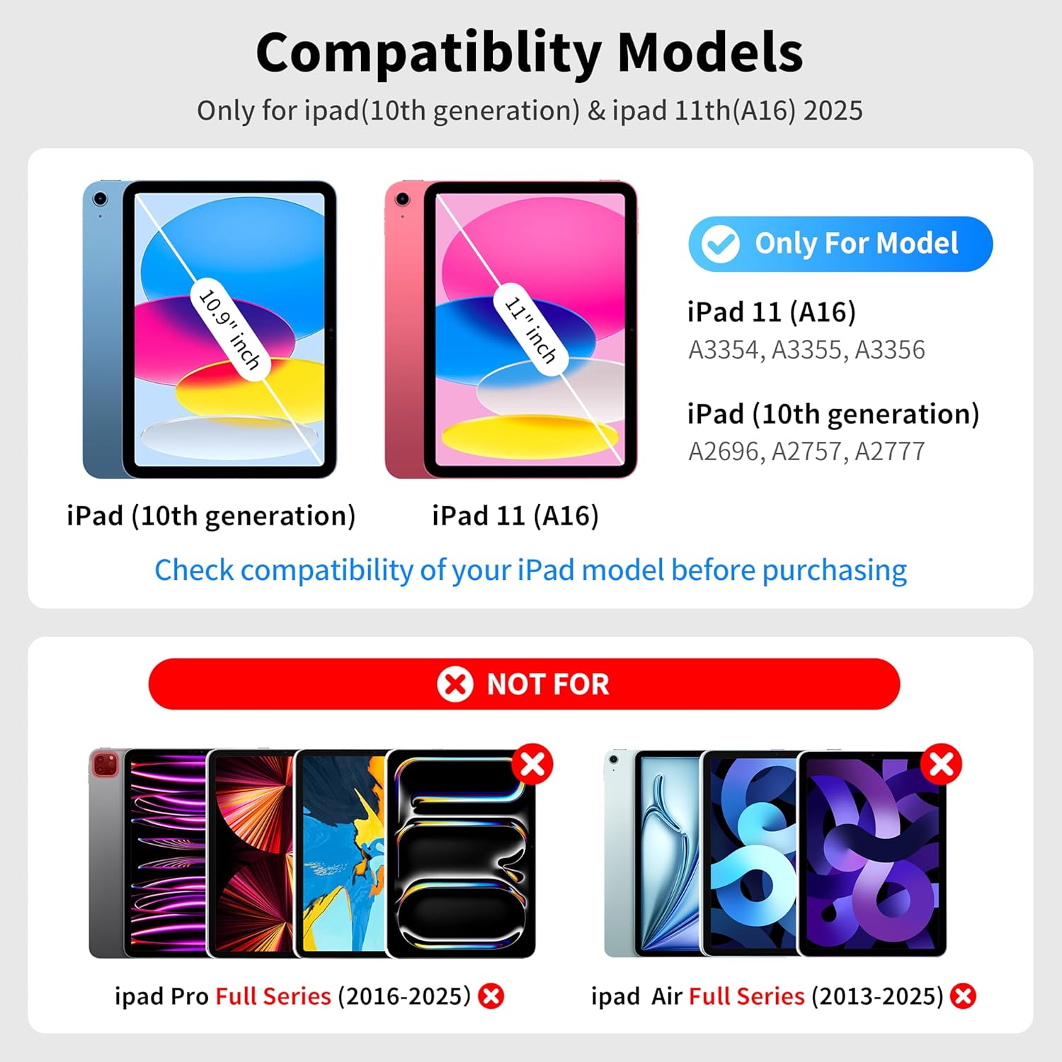 - Compatible Devices : iPad (10th generation) Model: A2696, A2757, A2777 and iPad 11 (A16) Model: A3354, A3355, A3356