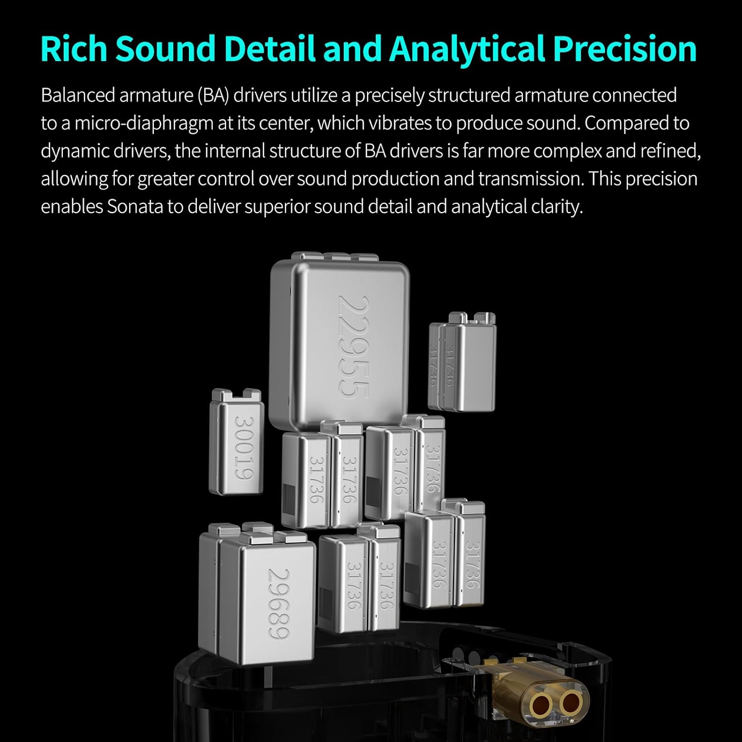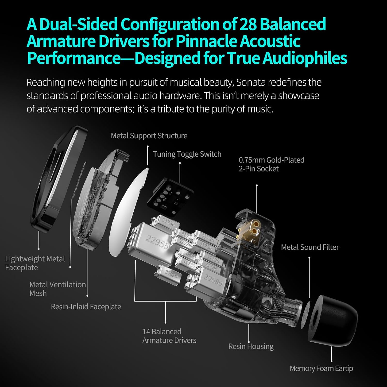 - Unparalleled Sound With 28BA Driver: This 2x14BA set definitely can beat everything you heard before. Sonata utilize 10 treble BA, 1 mid-treble BA, 2 mid BA , 1 bass BA, each driver here has been carefully chosen, they serve designated functions within a complex crossover architecture, so this full BA set and the ability to handle fast and complex audio passages. Excellent tuning and tonal balance, you might not want to take them off