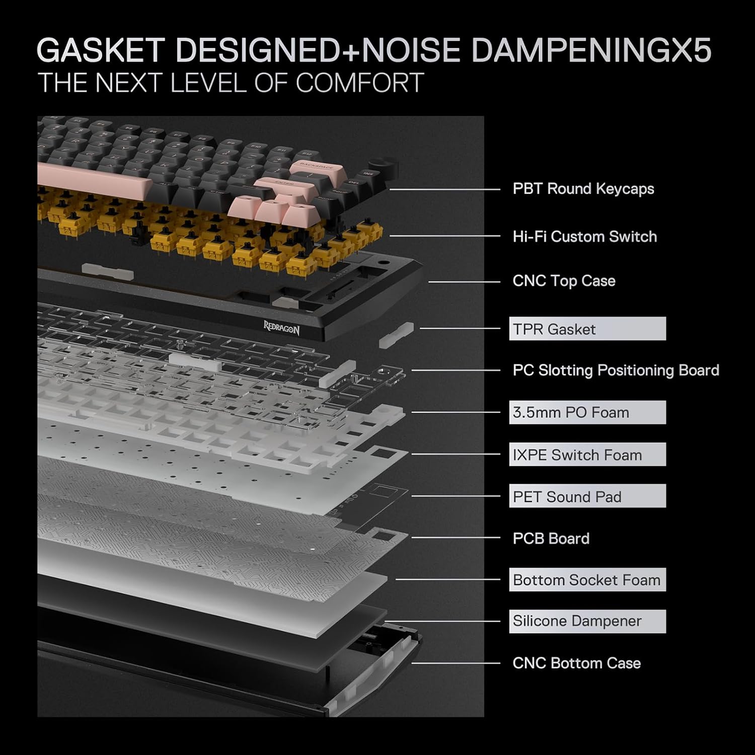 - Noise Dampening x 5 - Equipped with 3.5mm PO foam, IXPE switch foam, PET sound pad, bottom socket foam, silicone bottom pad along with the silicone gasket. Significantly reduce the hollow noise, creating dampened and ultra-clean typing acoustics, making each keystroke satisfying and comfortable