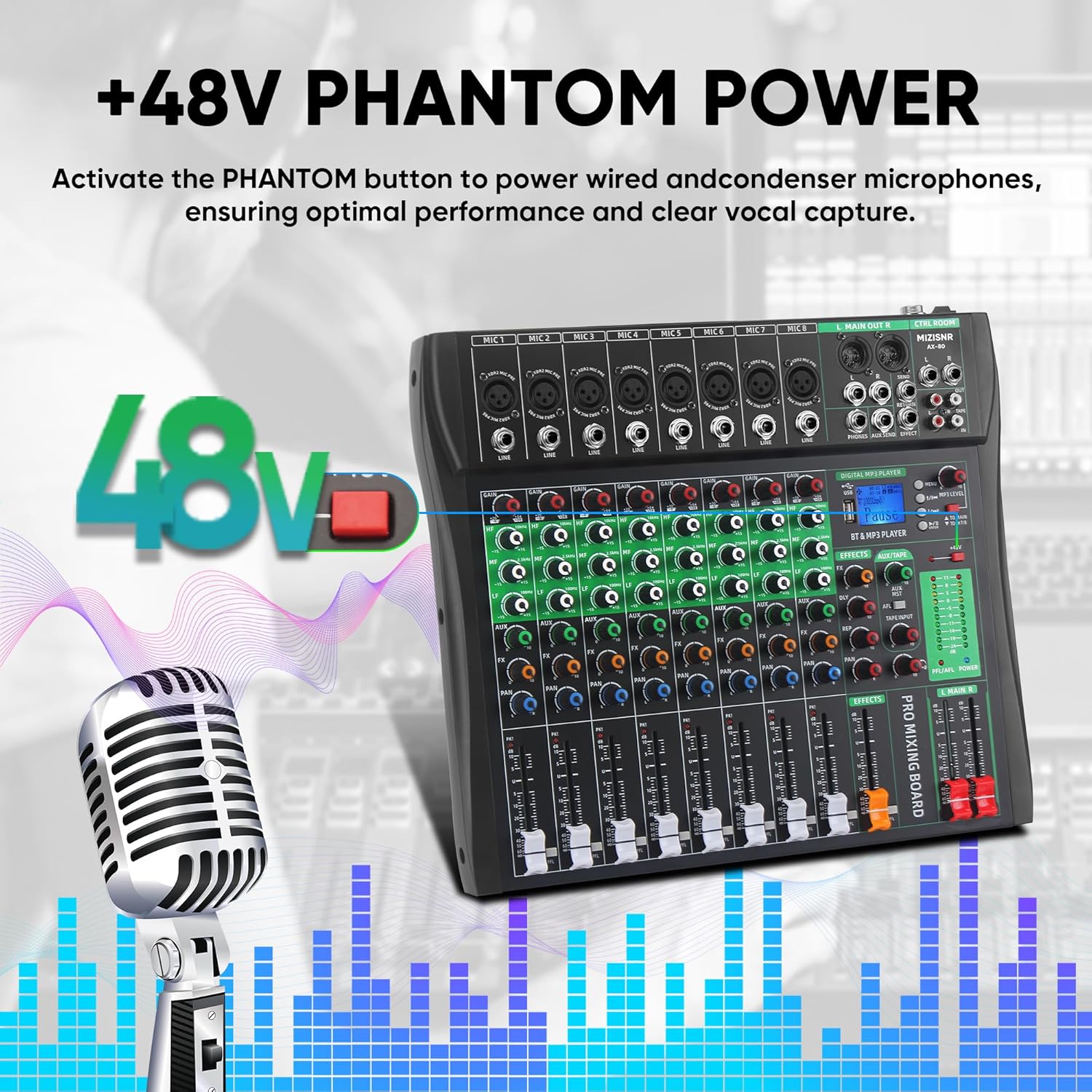- Crystal-Clear, Noise-Free Performance: Built for clarity, this mixer features gold-plated XLRs, balanced line inputs, ensuring ultra-low noise levels. The +48V Phantom Power Supply supports wired, wireless, and condenser microphones as well as instrument connections, guaranteeing professional-grade audio quality every time.