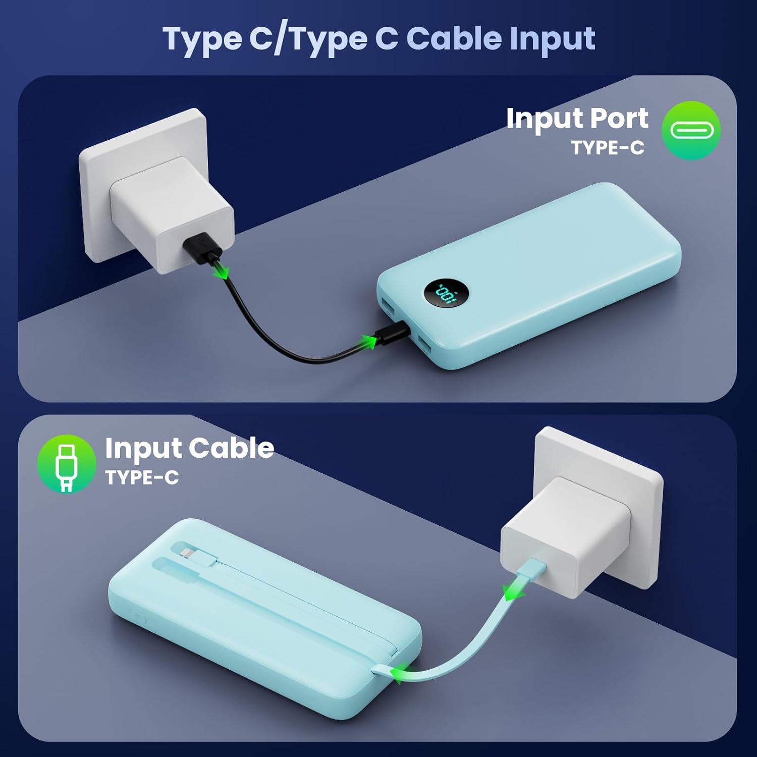 - Widely Compatibility Power Bank with Built-in Cables: USB C portable charger has 2 built-in cables (iOS, Type C) and 3 Charging ports (USB A 1/2, Type C), compatible with almost all types smart devices on market such as iPhone 16 15 14 13 12 11 Series, XR, XS Max, Samsung S24, S23, S22, S21, S20, A52, A32, Z fold series, Z flip series, and Google Pixel series, and other Android phones, iPad, tablets, etc
