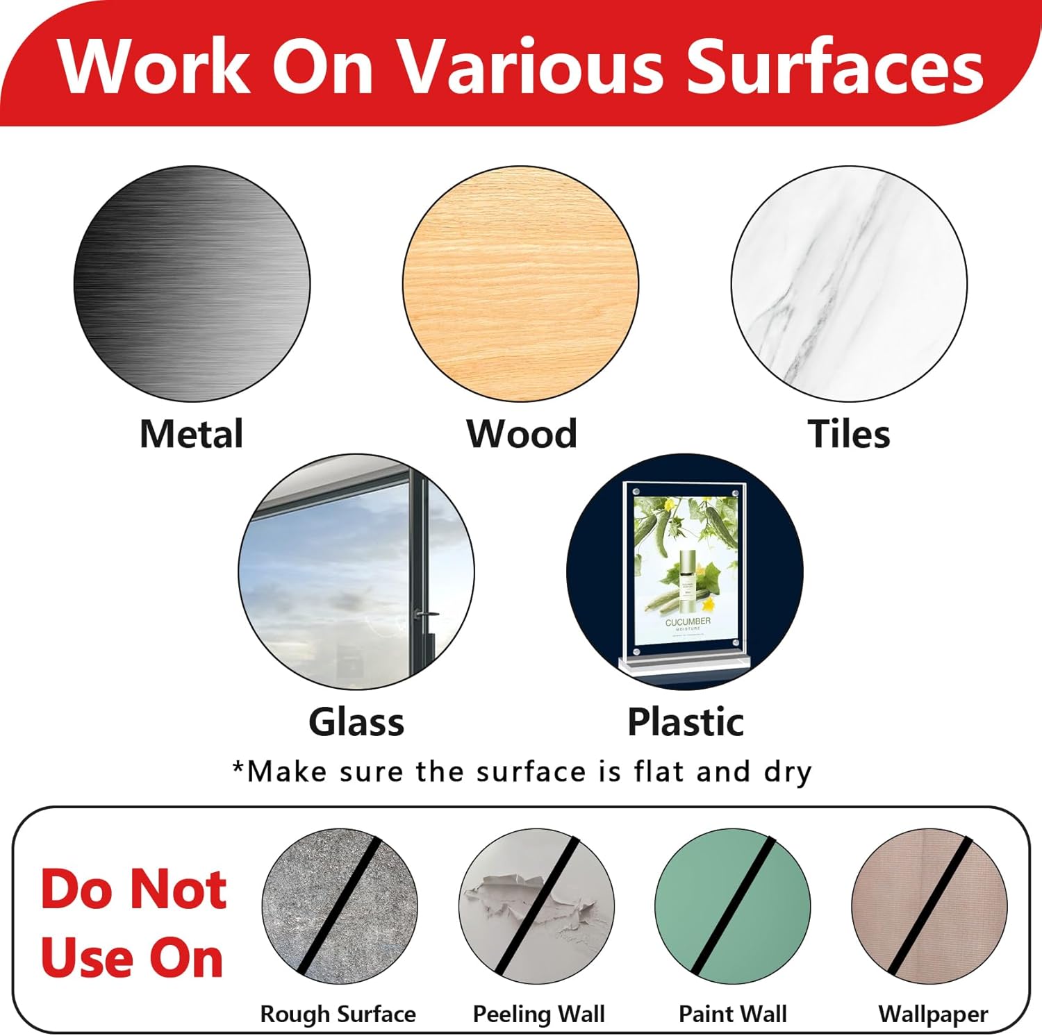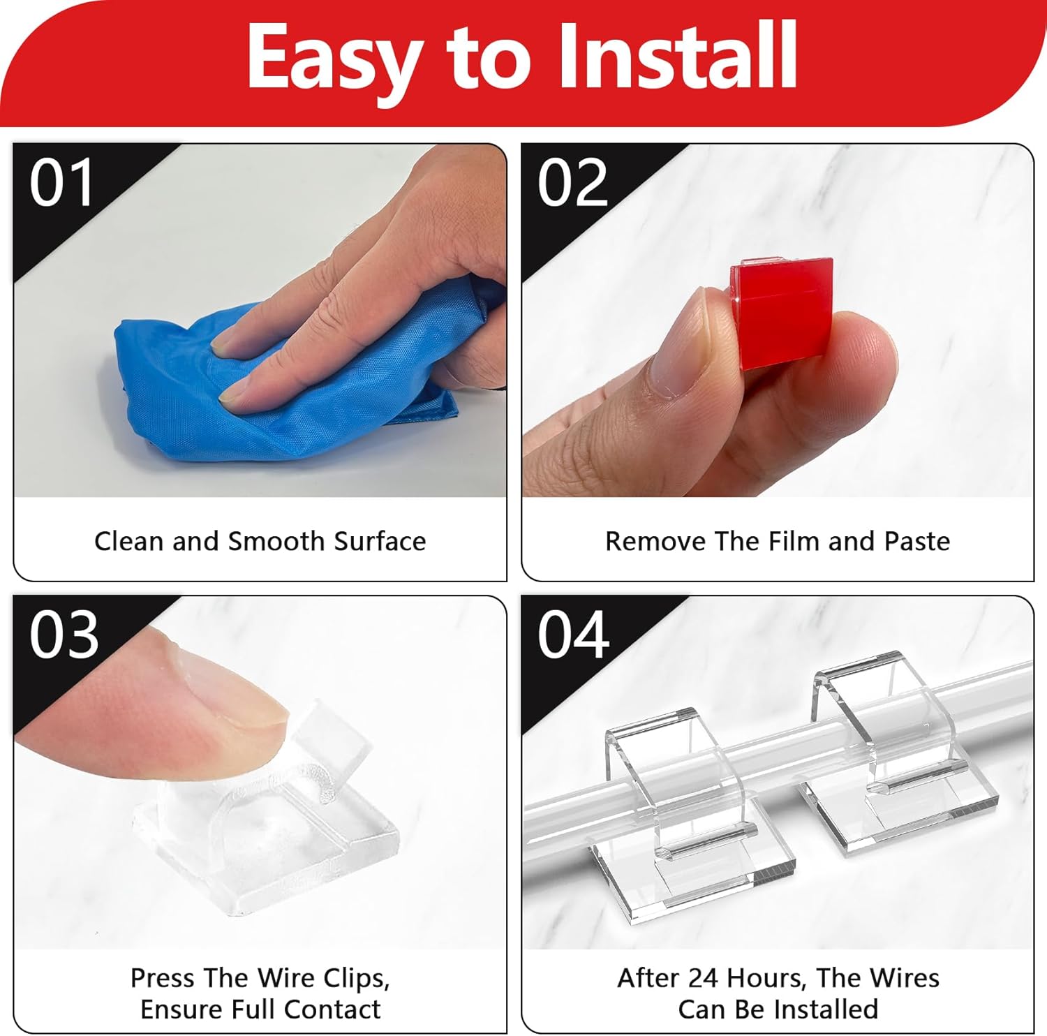 - 【Warm Tips】 Make sure to clean the mounting surface with alcohol pads before you use the wire holder clips, stick them on and press firmly for 30 seconds, and use them after 24 hours for maximum adhesion. As the adhesive is very strong, it is recommended that you use a tool to remove the wire clip, such as a shovel. There will be no residue after removal.