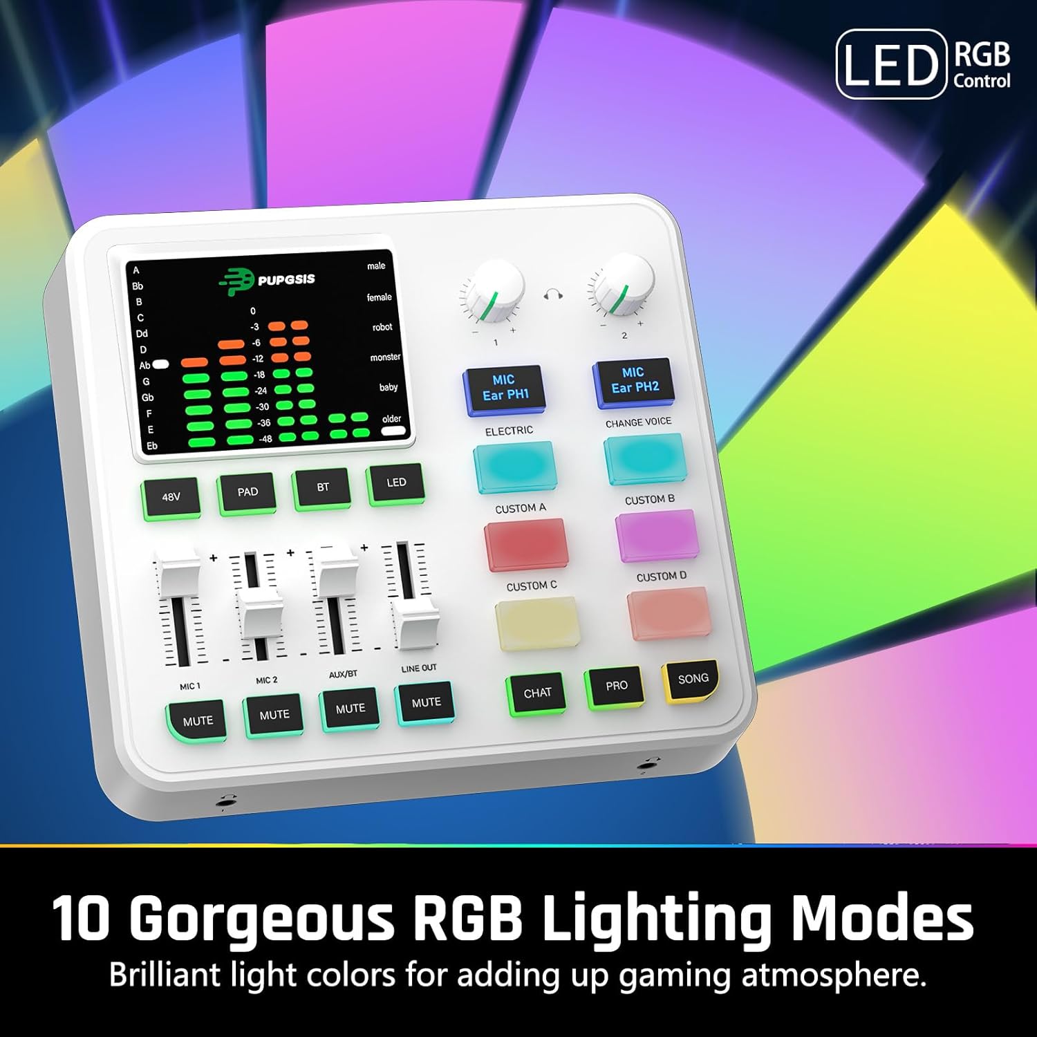 PUPGSIS qwe Gaming Audio Mixer, Audio Interface for PC/Podcast/Streaming, Sound Board with 3.5mm/XLR Mic Input, 48V Phantom Power, Voice Changer, Live Sound Card with DJ Mixer Effects(White)