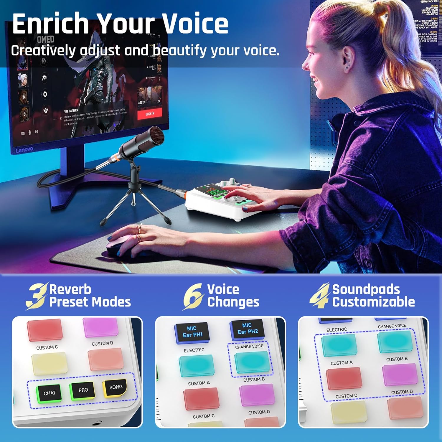 - Customize Your Audio: This gaming audio mixer features six voice-changing modes, allowing you to easily experiment with different sounds or add a touch of humor to your games. With four customizable soundpads, you can add and trigger your favorite sound effects on the spot, bringing increased creativity and interaction to your gaming or streaming. Additionally, 2 reverb presets offer a fresh audio experience, helping you present the best voice state in more scenarios.