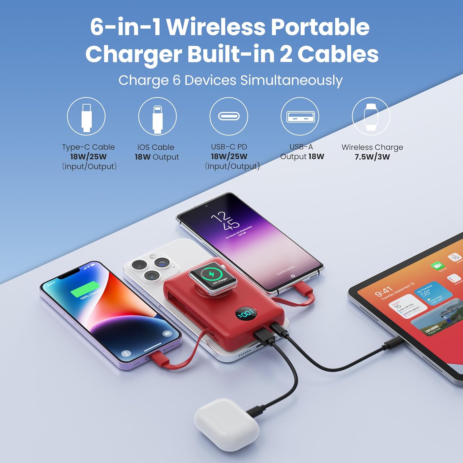- ă6 Device Charging, 6 Outputs & 2 Inputsă6-in-1 versatile portable charger features double-side magnetic wireless charging capability (7.5W for iPhone/Airpods and 3W for Apple Watch) , built-in 2 cables (18W iOS + 25W Type C), 2 USB ports (25W USB-C + 18W USB-A), total 6 outputs fast charging for 6 devices simultaneously, owning this powerful, quick-charging solution keeps all your devices powered up efficiently and conveniently. (USB-C port and Type-C cable support input/output)