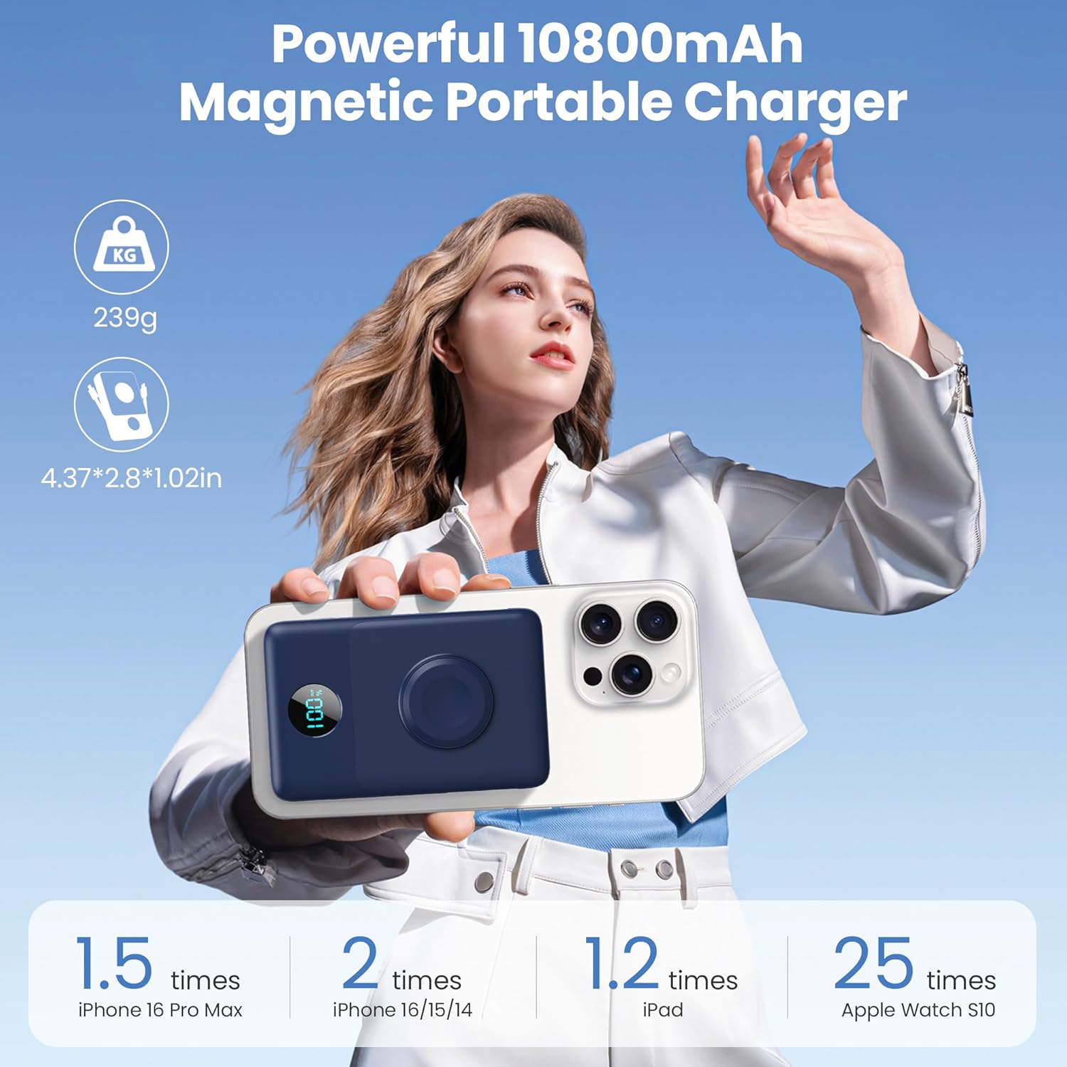 - ă6-in-1 Magnetic Portable Charger with Built in CablesăPortable charger with real powerful 10800mAh battery which can charge for iPhone 15/16 2 times, 25 charges for iWatch, 1.2 charge for iPad. Smart LED display clearly show the remaining power. Measuring 4.37*2.8*1.02in and weighting 239g, the sleek and compact design fit effortlessly into bag and pocket, making it the perfect travel companion.