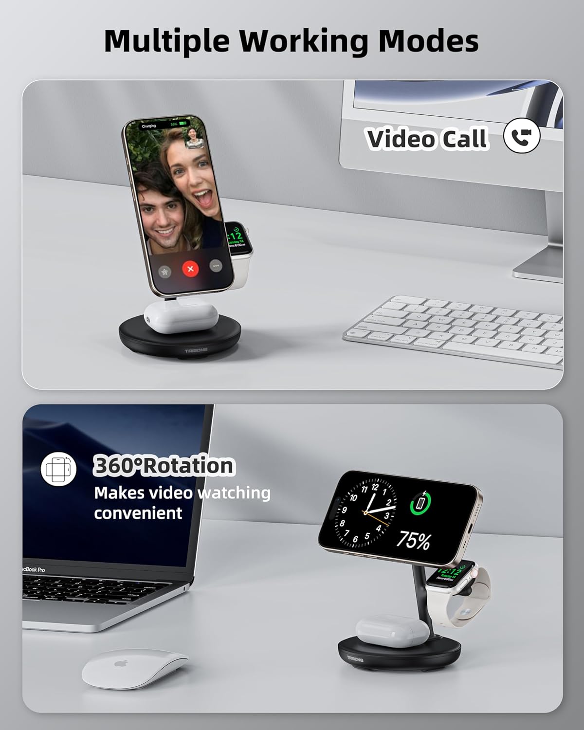 3 in 1 Magnetic Wireless Charger Stand for Apple Devices, TRIBONE Fast Charging Station for iPhone 16/15/14/13/12 Series, Apple Watch, Airpods (Black)