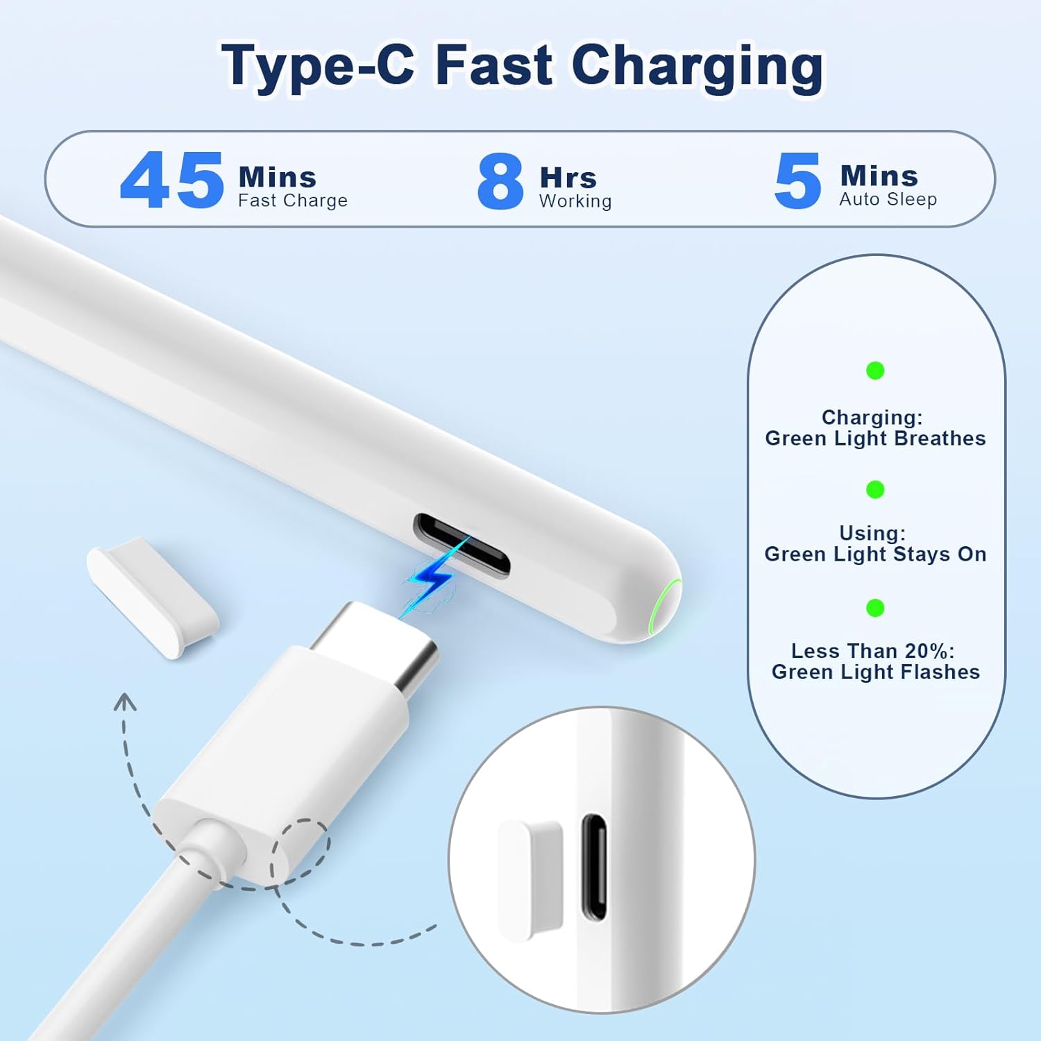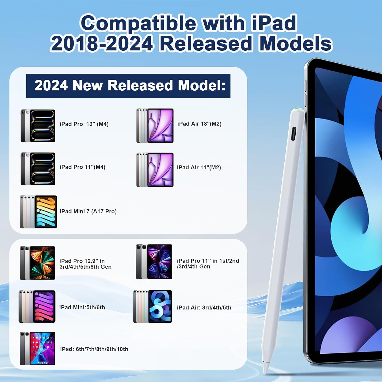 - USB-C Fast Charge Compatibility: Upgrade Stylus pencil Same as Apple Pencil 2nd Generation supports USB-C Fast Charge and Compatible With iPad 2018-2024 Model: iPad Pro 13”(M4)/12.9”/11”,iPad Air 6(M2)/5/4/3,iPad Mini 7(A17 Pro)/6/ 5,iPad10/9/8/7/6 and fully charging in 30 minutes and up to 8 hours of continuous use and Power display: Charging: green light breathes; Using: green light stays on; Less than 20% power: red light flashes