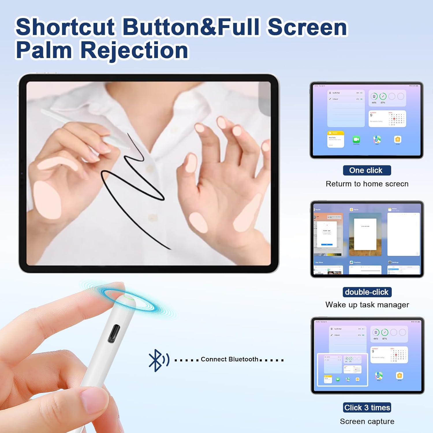 - Time-Saving Shortcut Button: Peaboni 2nd Stylus pen for ipad 9 generation same as apple pencil pro 2nd generation is equipped with a shortcut button, after connecting to Bluetooth, Tap the button at the top to implement shortcut functions:One Tap return to the main screen;Double-Tap back to the APP selection page;Click Three Times in a row to quickly take a screenshot