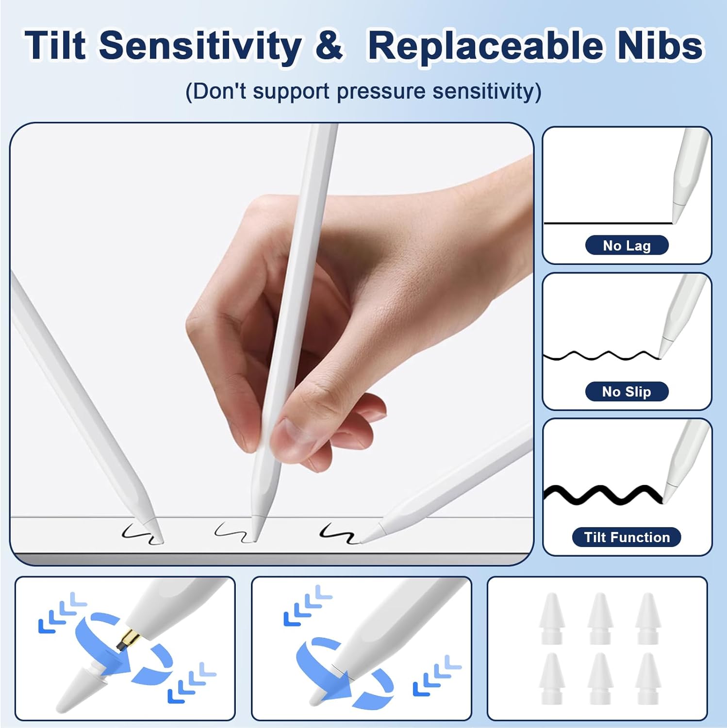 - Tilt Sensitivity: Peaboni stylus pen for iPad 10th generation is equipped with 1.5mm POM nib gives high sensitivity and accuracy, with no lag, no skipping, no scratches and no delays. Built-in tilt-sensing technology,allowing tilt the stylus at different angles to precisely control and change line thickness and shading,making writing and drawing more free. And we also provide 4 replacement nibs, you can change the POM nib if you feel the used nib not sensitive(Please kindly know that our pencil don't support pressure sensitivity)