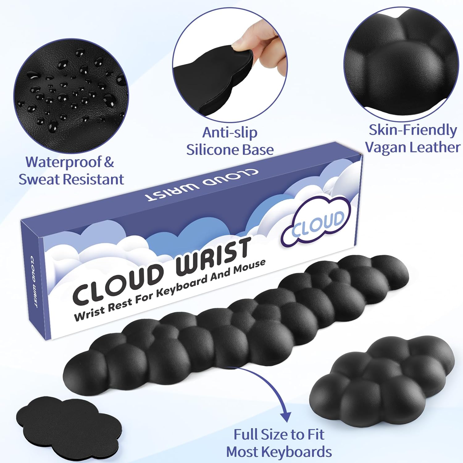 Cloud Wrist Rest for Keyboard and Mouse, Memory Foam PU Leather Keyboard Wrist Rest with Ergonomic Support, Non-Slip Base, Cute Arm Rest Pad & Palm Cushion, Office Desk Accessory, Black