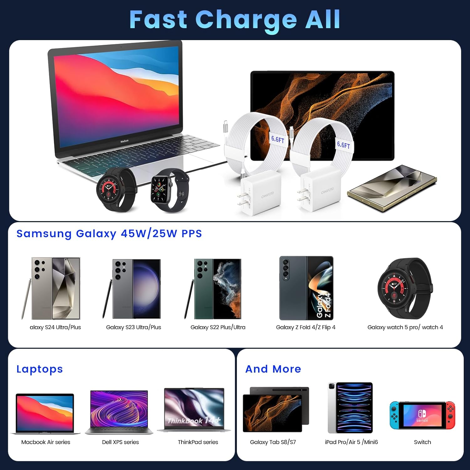 - 【2X 6.6FT Type C Cord】: This samsung galaxy s24 ultra charger kit come with 2pack 6.6ft/2m 100W Type-C charger fast charging cord, meticulously crafted with premium nylon braiding. The tangle-free cables provide the ultimate convenience, allowing you to comfortably charge your device from the comfort of your bed, couch, or office. Enjoy unparalleled flexibility and durability with galaxy charger fast charging cord.