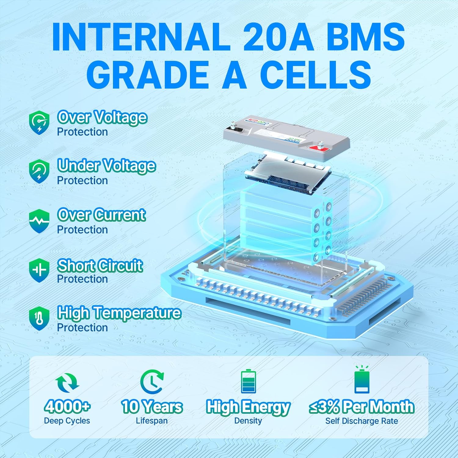 - ă10 Years Lifespan, Built To LastăRedodo 12V 20Ah Lithium Iron Phosphate Battery is made of EV grade cell with stable performance, low self-discharge rate, and more than 4000 cycles, which is more than the 300-500 cycles of traditional lead-acid battery. With a battery life of up to 10 years, you don't need to replace the battery frequently and there is no need for maintenance.