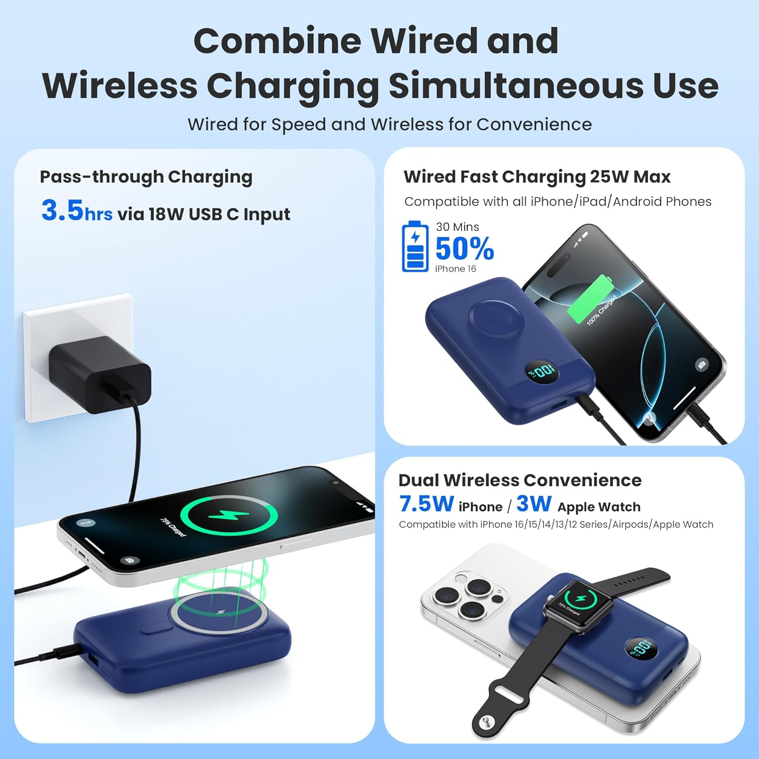 - ăWireless & Wired Charging Widely CompatibleăPortable phone charger combines magnetic wireless charging compatible with MagSafe-enabled iPhone cases, iPhone 16/15/14/13/12 series, Airpods 2/3/Pro/Pro 2 and Apple Watch 10/9/8/7/6/5/4/3/2/Ultra 2/1/SE, along with wired charging via USB-C and USB-A ports for other iPhone, iPad, Samsung Galaxy, Google Pixel, Moto, LG series and more Android devices.