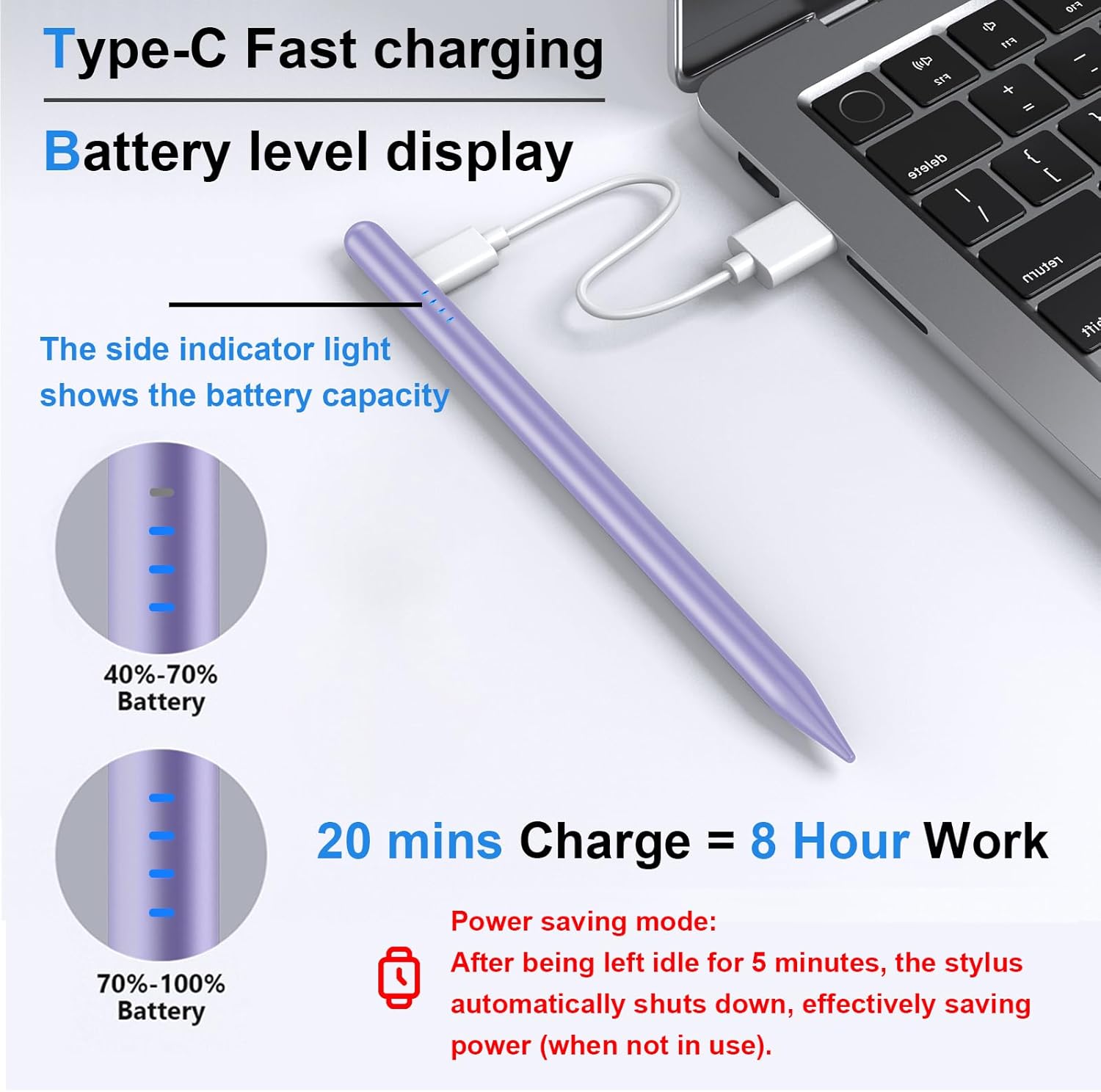 - ăBattery Indicator / Type-C Chargingă This iPad pen uses the popular Type-C charging port for charging, and can be used for 8 hours after 35 minutes of charging. When charging, four lights on the side of the stylus will light up gradually, each light represents 25% of the power, so you can observe the charging status and power usage in real time, and keep track of the remaining power at all times to ensure that you don't drop the ball during critical work time. The iPad stylus has a sleep function. When you forget to turn it off, keep it still for 5 minutes and the stylus will automatically turn off, effectively saving battery life