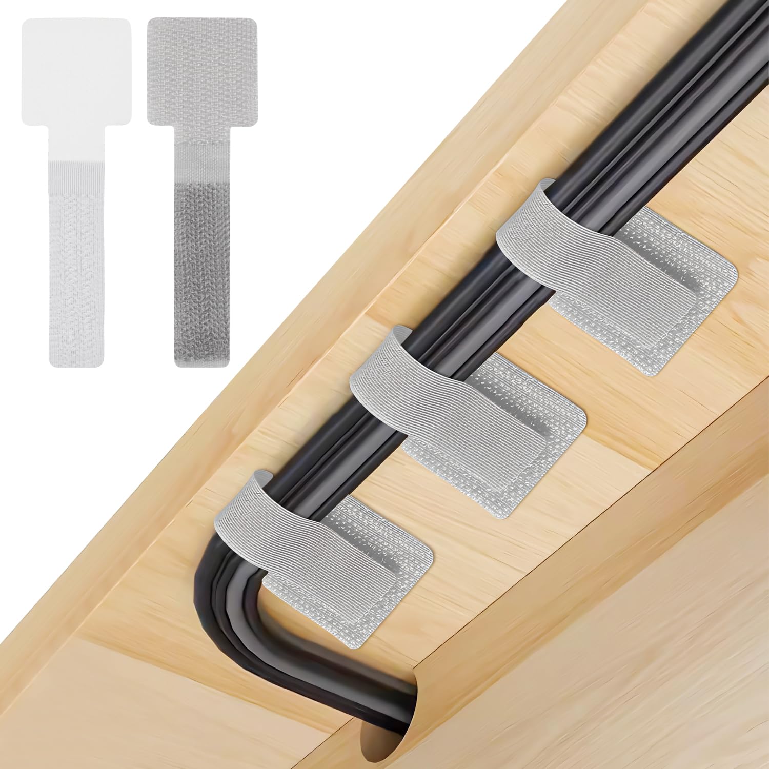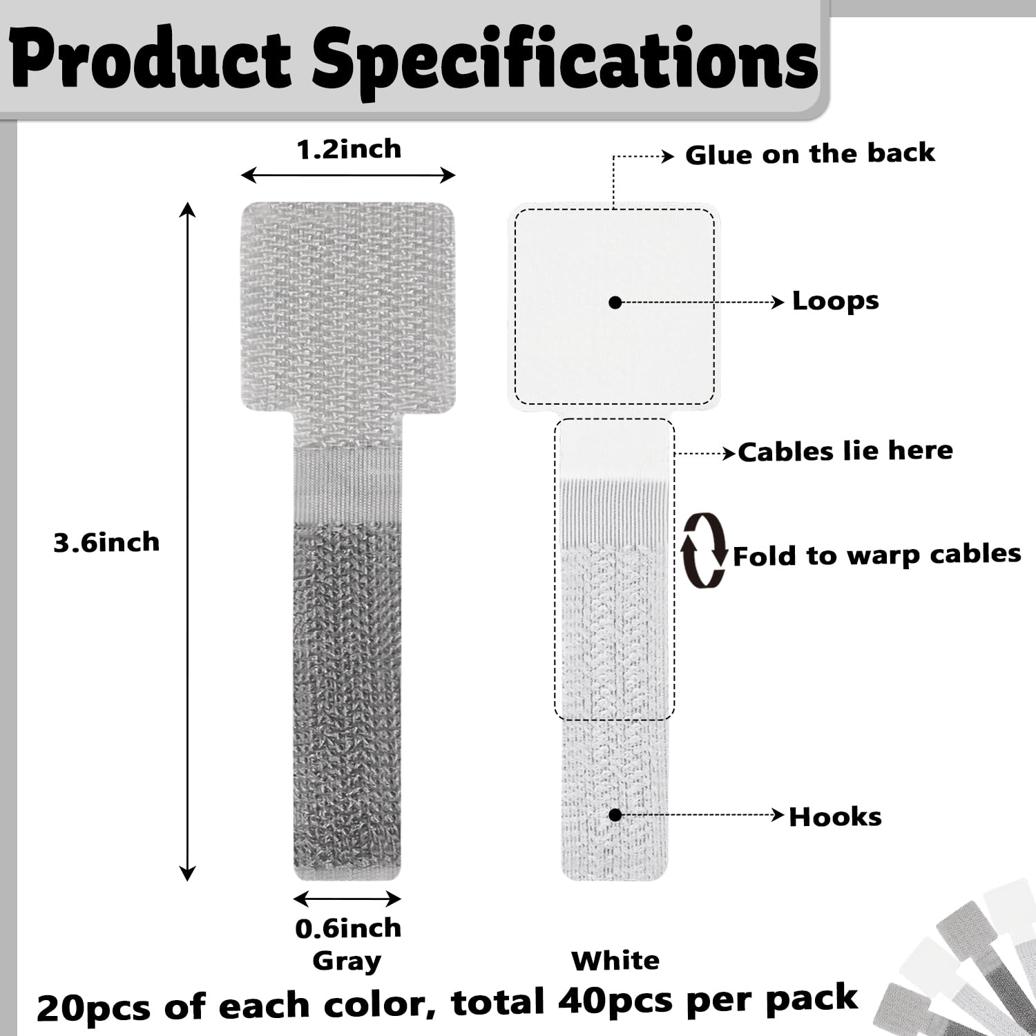 40 PCS Hook and Loop Cable Ties, Self-Adhesive Hook and Loop Cable Straps, Sticky-Back Wire Organizer for Under Desk Cable Management, Adjustable Cable Straps Clips for Home Office(White, Gray)