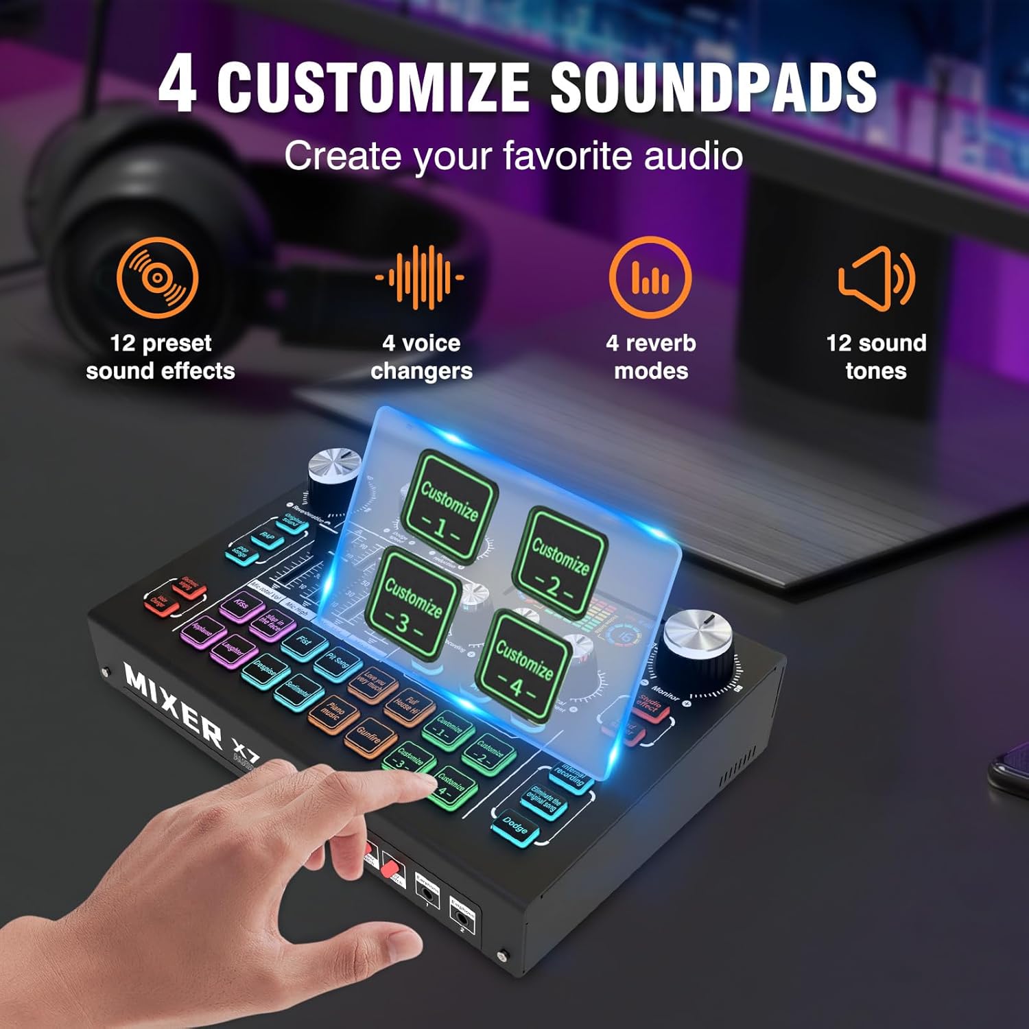 - 【4 CUSTOMIZED SOUNDPADS, 12 PRESET SOUND EFFECTS & 4 VOICE CHANGING MODES 】: The audio mixer with 4 customized buttons which can be recorded any sound effect you want. In addition, there are 12 preset sound effects and 4 voice changing modes for option. You can change your voice to engage your viewers and add fun for your streaming. Further more, the accompaniment mode allows you to hear the original songs while the audience only hear the accompaniment, perfect for singing
