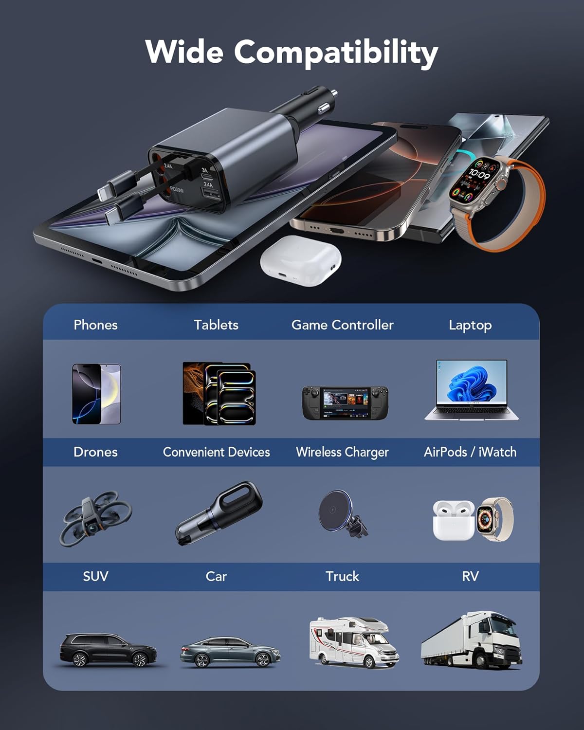- 【Multi-device Compatible Car Charger】This 4-in-1 69W car charger is designed to meet the diverse charging needs of the modern traveller. Compatible with iPhone 16/16 Pro/16 Pro Max/16 Plus/15/15 Pro/15 Plus/15 Pro Max/14/14 Pro/14 Pro Max/14 Plus/13/13 Pro/13 Pro Max/13 Mini/12/12 Pro/12 Pro Max/12 Mini/11/11 Pro/11 Pro Max/XS/XS Max/XR/X, usb c charger for iPad Pro/Air/Mini,Apple Watch10,AirPods4, usb a charger compatible for Samsung Galaxy Ultra2/S24/S23/S22/S21/S20/S10/S9/S7/A12/A13/A22/A32/A52/A53/Note 20, LG, Google Pixel, Kindle, Wireless charger, Tablets, Switch, etc and more. This charger ensures that all your gadgets are powered efficiently and safely