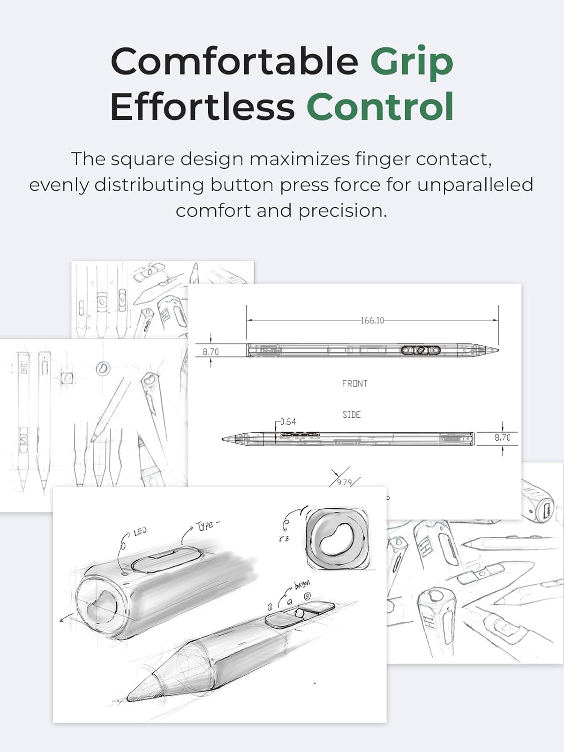 - [Original Designed with Precision & Tilt Sensitivity] Korea’s patent-designed stylus pen features an ergonomic, anti-roll square shape for comfort and reduced hand fatigue. Offering precise accuracy, palm rejection, and 15°-90° tilt sensitivity (works with supported apps only), ensuring a seamless pen-to-paper experience and a natural feel for drawing or writing. Ideal for artists, journalists, engineers, educators, and students, this stylus is a reliable alternative to the Apple Pencil for creative and professional use.