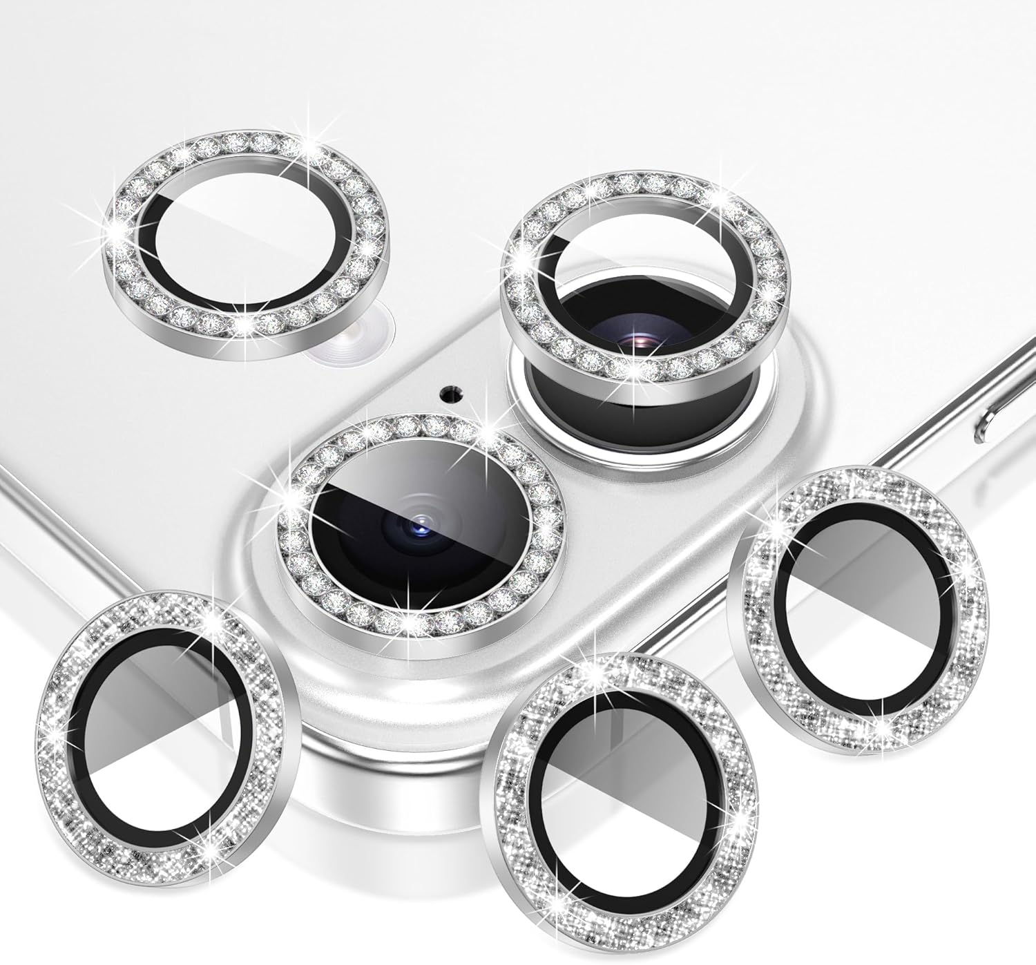 AGVEE 3+3 6 Pack for iPhone 16 6.1" / 16 Plus 6.7" Camera Lens Cover Protector, Bling Diamond & Bling Glitter Metal Ring 9H Tempered HD Glass Camera Cover Protector Film, Bling-Silver