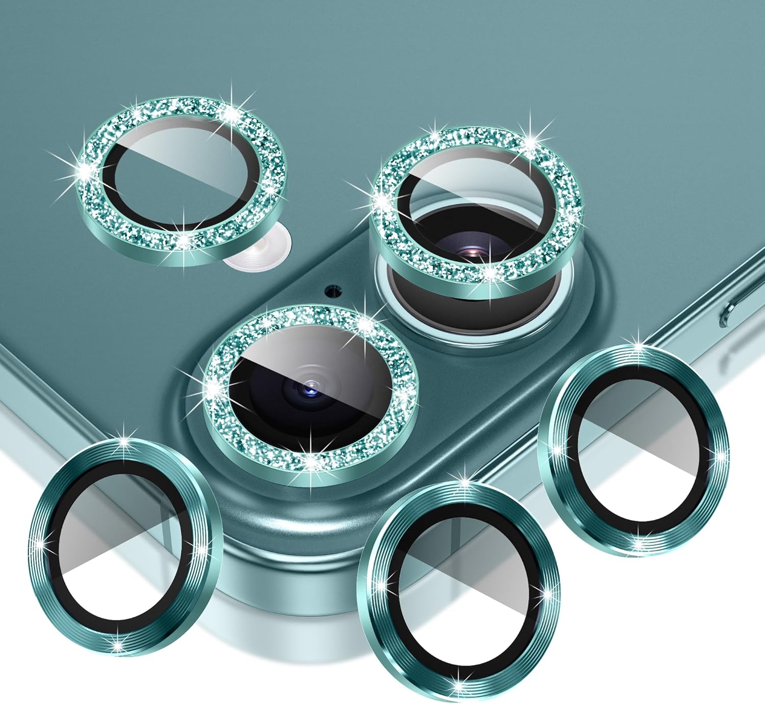 AGVEE 3+3 6 Pack for iPhone 16 6.1" / 16 Plus 6.7" Camera Lens Cover Protector, Bling Glitter & CD-Textured Metal Ring 9H Tempered HD Glass Camera Cover Protector Film, Glitter-Green