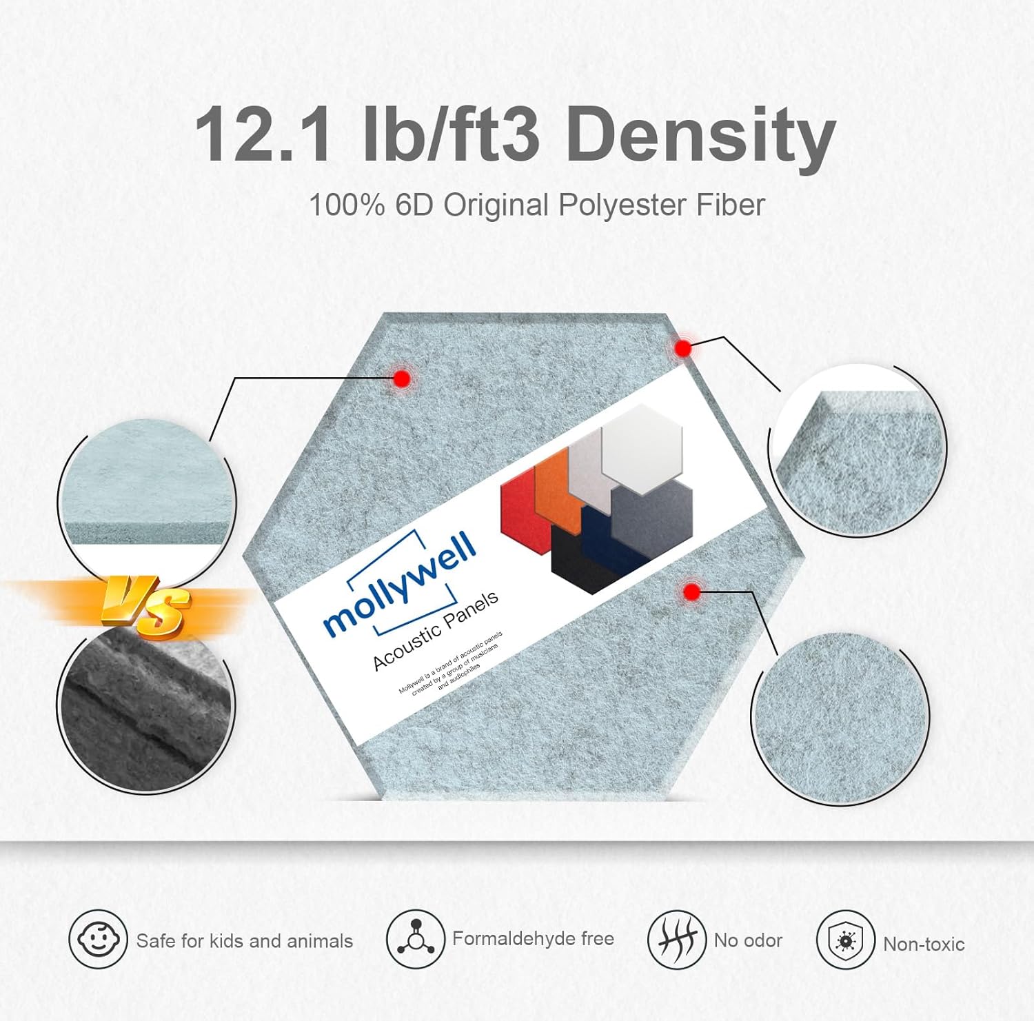 Mollywell Hexagon Acoustic Panels, High Density, Soundproofing, Decorative Noise Reduction Felt Wall Tiles for Ceilings, Home Office & Gaming Room (Smoky Blue), 14x12x0.4 Inch