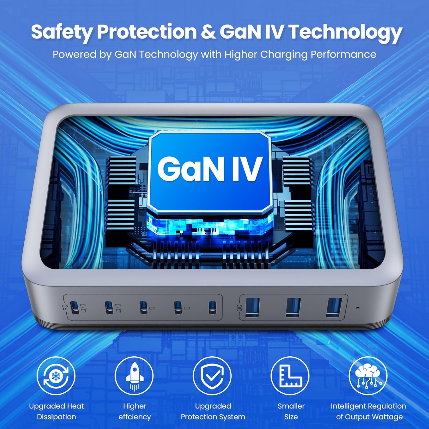 - ă8-in-1 USB C Charging Stationă: The USB C Wall Charger features 5 USB C ports and 3 USB A ports for powering phones, tablets, headphones, smartwatches, game consoles and more. No need to wait, you can quickly charge up to 8 devices at the same time, and each port intelligently distributes power to ensure you get optimal charging efficiency!no need for more adapters,this 8-in-1 charging station will reduce your accessories burden and help you create an organized and clean desktop.Our GaN IV desktop charging station easy to carry,just L 4.7*W 3.3*H 1.1 inch and weighs 0.6kg,With the free 5FT/1.5m long Detachable power charging cordïŒApplicable to desktop, bedside, counter, nightstand, office.