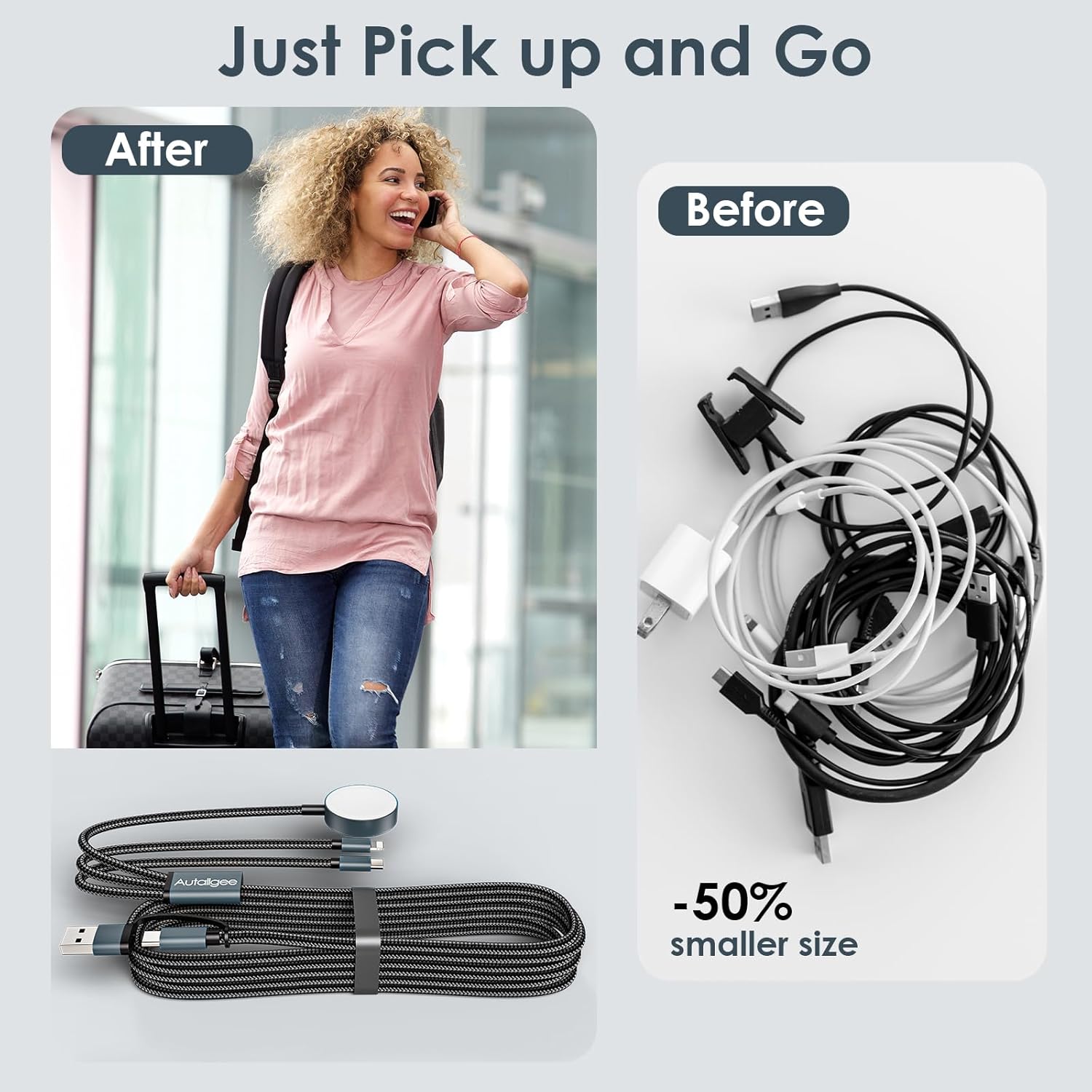 - 🎁Super 3 in 2 Multi-Function: Autallgee multi charging cable has 6 charging ways- USB C/A to iWatch charger & USB C/A to Lighting cable & USB C/A to Type C Cable. What's remarkable is that it can charge three different devices simultaneously,Our multiple charger cord is compatible with iWatch Ultra 2/Ultra/SE 2/SE/Series 10/9/8/7/6/5/4/3/2/1,【Please note it doesn't support charge Samsung watch】iPhone16/15/14/13/12/11/8/7 Pro/Max/Plus/AirPods 4/Pro 2, Samsung Galaxy S24/S24+/S24 Ultra/S23/S22/S21/S20.