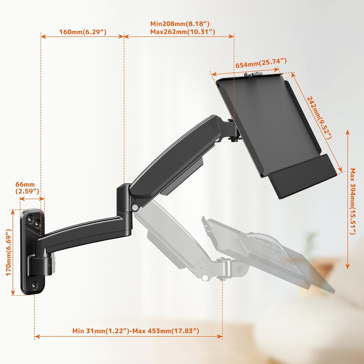 - Mechanical Spring Support:The smooth keyboard tray is supported by a powerful mechanical spring arm, allowing you to effortlessly raise or lower the tray by up to 15.5 inches. It supports a weight capacity of up to 19.8 lbs.