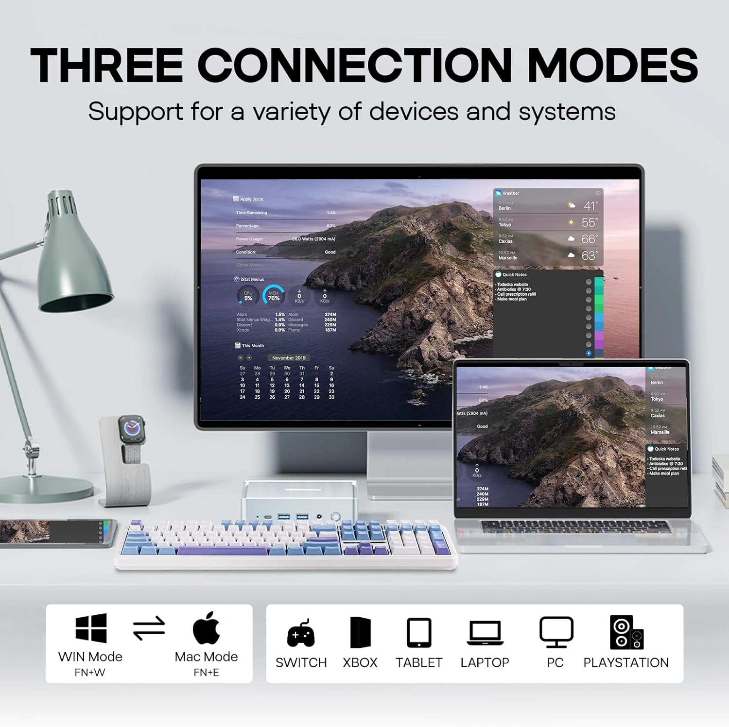- Wireless Keyboard with Limitless Compatibility: Packed with 4000mAh rechargeable batteries, double the power average gaming keyboard offers, F108 Wireless Keyboard grants up to 100 hours of continuous gameplay at peak performance with backlight off. Its versatile Bluetooth mode offers swift transaction from PC, Mac Laptop to Android Tablet, while the 2.4GHz wireless and USB Cable mode promise competitive-level stability and responsiveness with 1000Hz polling rate