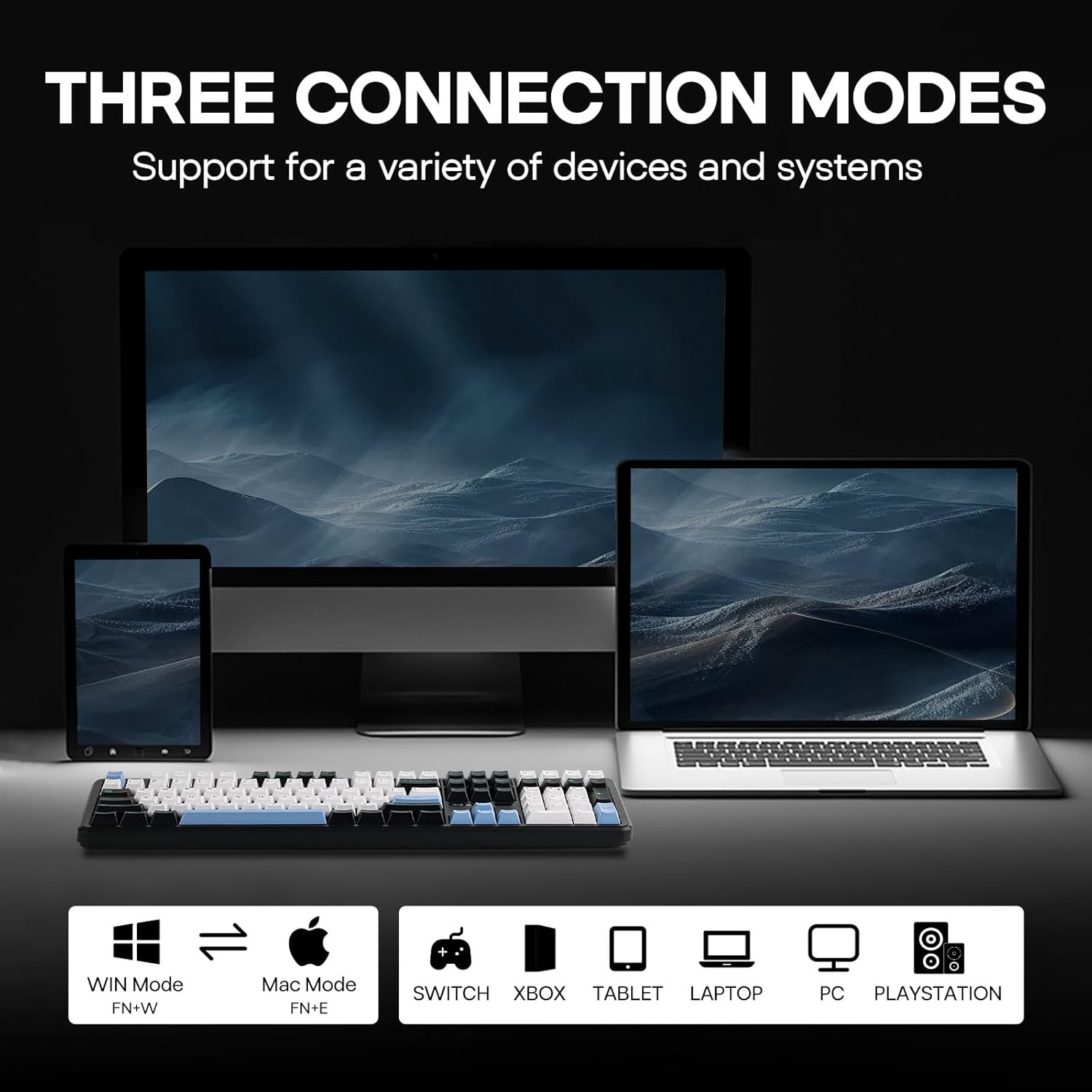 - Wireless Keyboard with Limitless Compatibility: Packed with 4000mAh rechargeable batteries, double the power average gaming keyboard offers, F108 Wireless Keyboard grants up to 100 hours of continuous gameplay at peak performance with backlight off. Its versatile Bluetooth mode offers swift transaction from PC, Mac Laptop to Android Tablet, while the 2.4GHz wireless and USB Cable mode promise competitive-level stability and responsiveness with 1000Hz polling rate