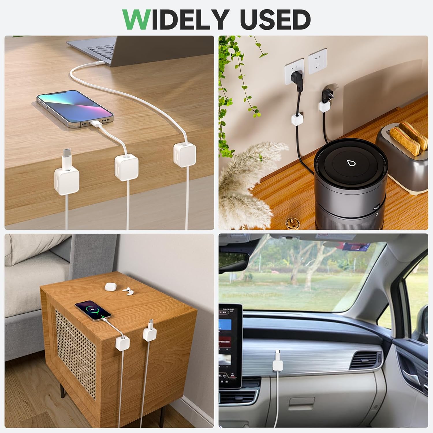 - 【Versatility】Cord management size is 0.8 ‘L x 0.8 “W x 0.45 ”H, 2025 newest slim design, can be better adapted to or hidden in the narrow space. Installed in the home or office on the desk, nightstand, wall, car,etc. Compatible with most cables up to 0.27’ OD. e.g. mobile phone USB charging cable/HDMI/computer/headphone/light strip/small appliances power cord etc.