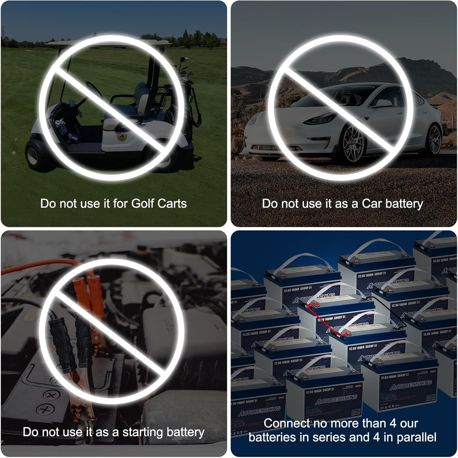 - β Autocessking 12v lithium battery is designed for energy storage purpose only. We do not recommend using it as a starting battery for cars or golf carts.