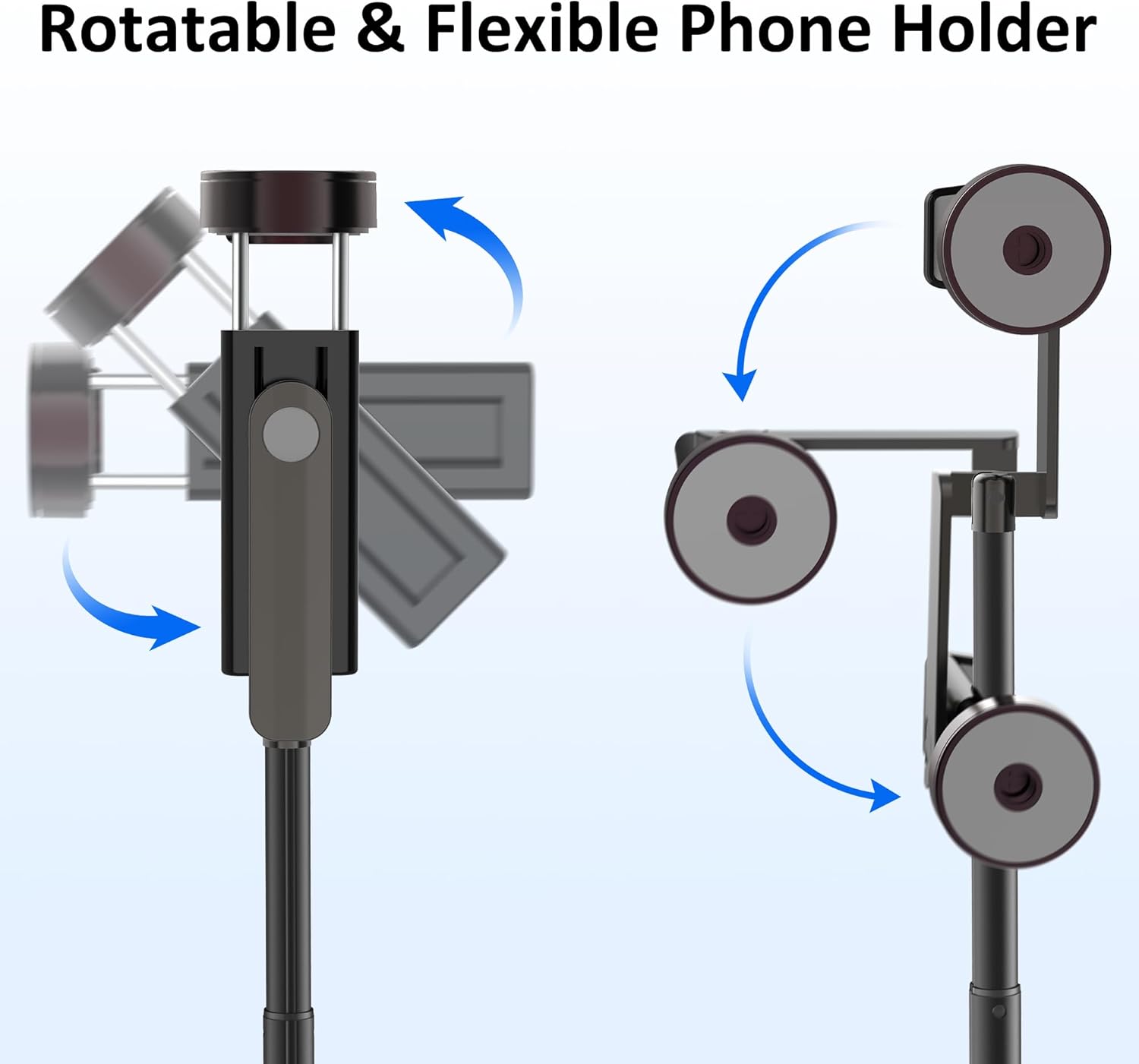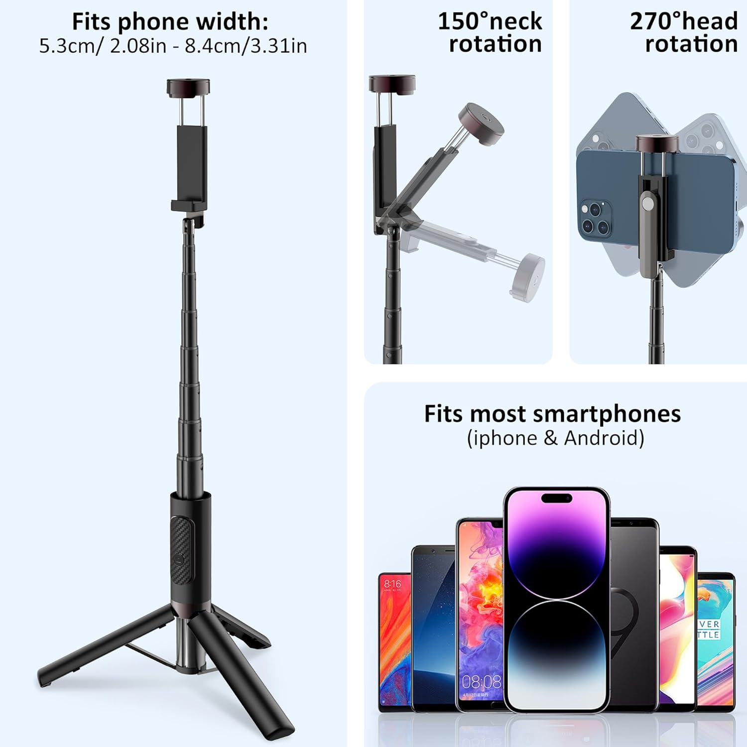 - ROTATABLE SELFIE STICK TRIPOD - 220Β° adjustable rotation bracket + 270Β° swivel phone holder for flawless angles.Max 33 in extendable aluminum alloy stick (lightweight yet sturdy), Steady tripod base for shake-free videos and time-lapses.The cell phone holder can support phones with a width of 2.16in-3.42in (screen size of 4-7 inches), compatible with almost all cell phones. Built-in anti-slip pads to protect your phone from falling.