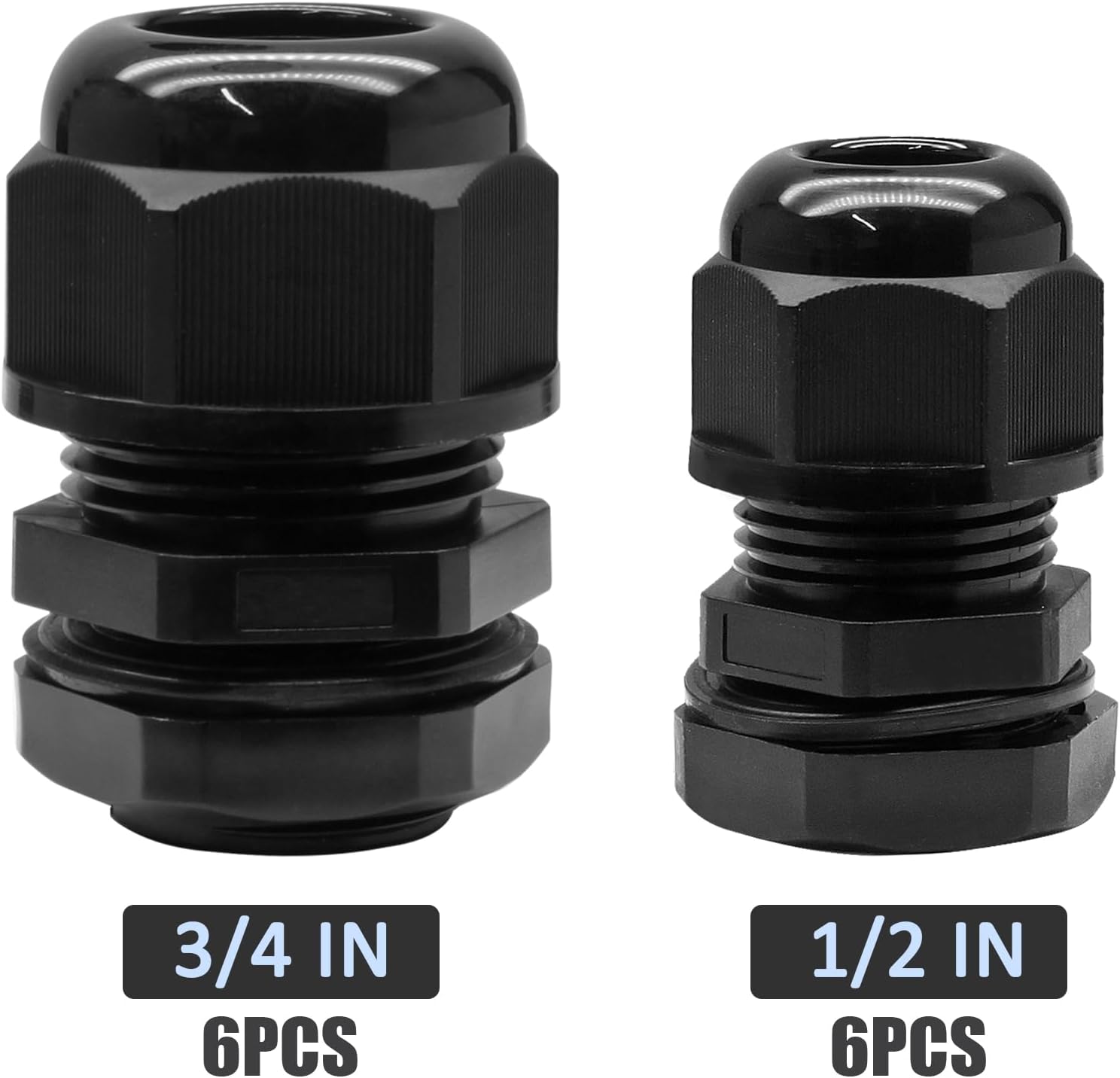 12 Pcs Nylon Cable Glands, Black Strain Relief Cable Cord Connector IP68 Waterproof Junction Box Wire Protectors Adjustable (6 Pcs 3/4" NPT + 6 Pcs 1/2" NPT)