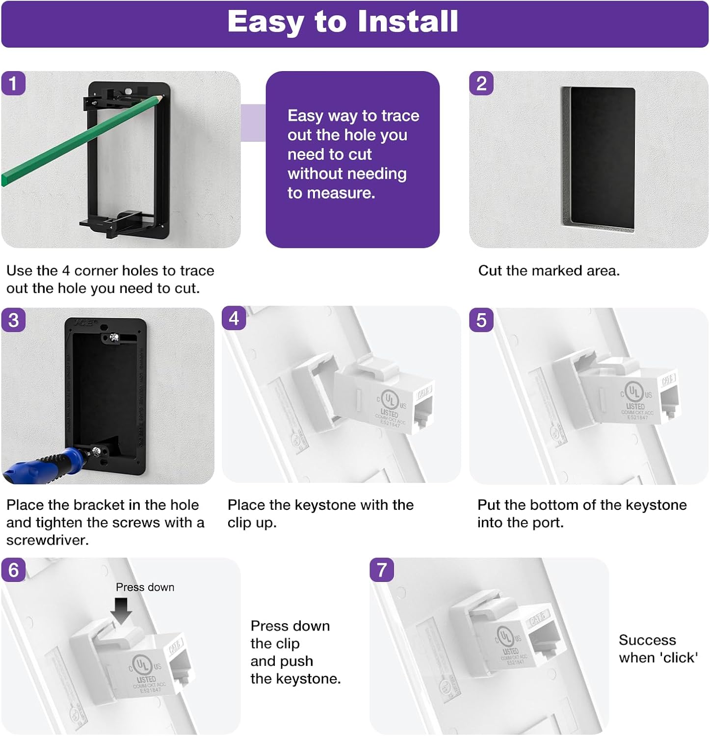 - UL-LISTED SAFETY AND SECURITY: The UL-Listed ABS ethernet wall plate and Keystone coupler feature flame-retardant and impact-resistant material. The solid construction keeps a risk-free and reliable network for your peace of mind without fuss at all