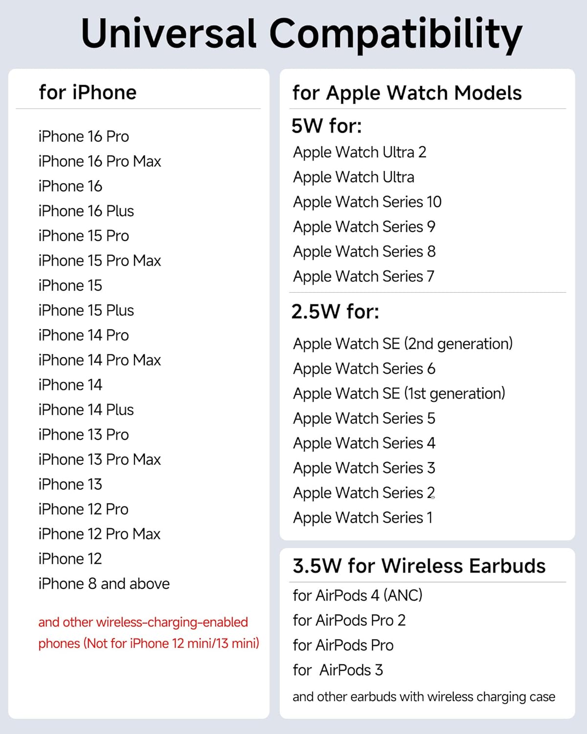 - Compatible Devices : Compatible with iPhone 16 Pro Max/16 Pro/16 Plus/16/15 Pro Max/iPhone 15 Pro/iPhone 15 Plus/iPhone 15/iPhone 14/14 Pro/14 Plus/14 Pro Max/13/13 Pro/13 Pro Max/12/12 Pro/12 Pro Max//11/11 Pro/11 Pro Max/SE/XS MAX/X/XR/8/8 Plus; For Apple Watch Ultra 2/9/8/7/SE 2/6/5/4/3/2/1/SE; for Samsung S24 Ultra/S24+/S24/Samsung Galaxy S23 Ultra/S23 Plus/S23/S23+/Z Fold 4/Z Flip 4/Samsung S22 Ultra/S22/S22+/S21 FE/Z Fold 3/Z Flip 3/S21/S21 Ultra/S20/S20 Ultra/S10/Note 10/Note 9 and more;Google Pixel 7 PRO/7/6/6 Pro and other Qi-enabled phones; For AirPods 4 ( with Active Noise Cancellation) /AirPods Pro 2/AirPods 3rd generation/Airpods 2/1/AirPods Pro/Galaxy Buds 2 Pro/Galaxy Bud Pro/Galaxy Buds/Galaxy Buds+/Galaxy Buds Live and all other earbuds with wireless charging case Compatible with iPhone 16 Pro Max/16 Pro/16 Plus/16/15 Pro Max/iPhone 15 Pro/iPhone 15 Plus/iPhone 15/iPhone 14/14 Pro/14 Plus/14 Pro Max/13/13 Pro/13 Pro Max/12/… See more