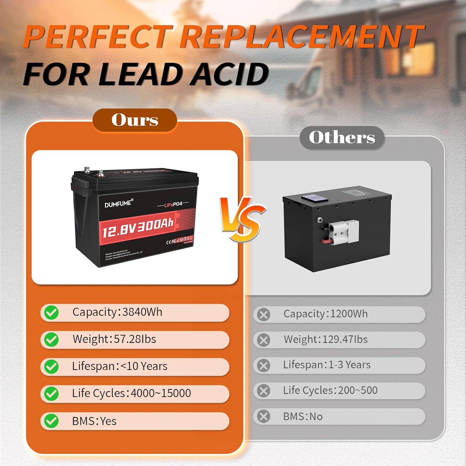- Compact & Powerful: Dumfume 12V 300Ah LiFePO4 battery Weighs Only 57 lbs, 1/3 The Weight Of A Comparable Lead-Acid Battery. Its Energy Density Is Nearly Double That Of An Equivalent Lead-Acid Battery, With An Impressive Energy Capacity Of Up To 3840Wh. Its Compact Design Is Easy To Carry And Install, Delivering Maximum Functionality In Minimum Space.Ideal for RV, Marine, trolling motor, and Off-Grid Systems.