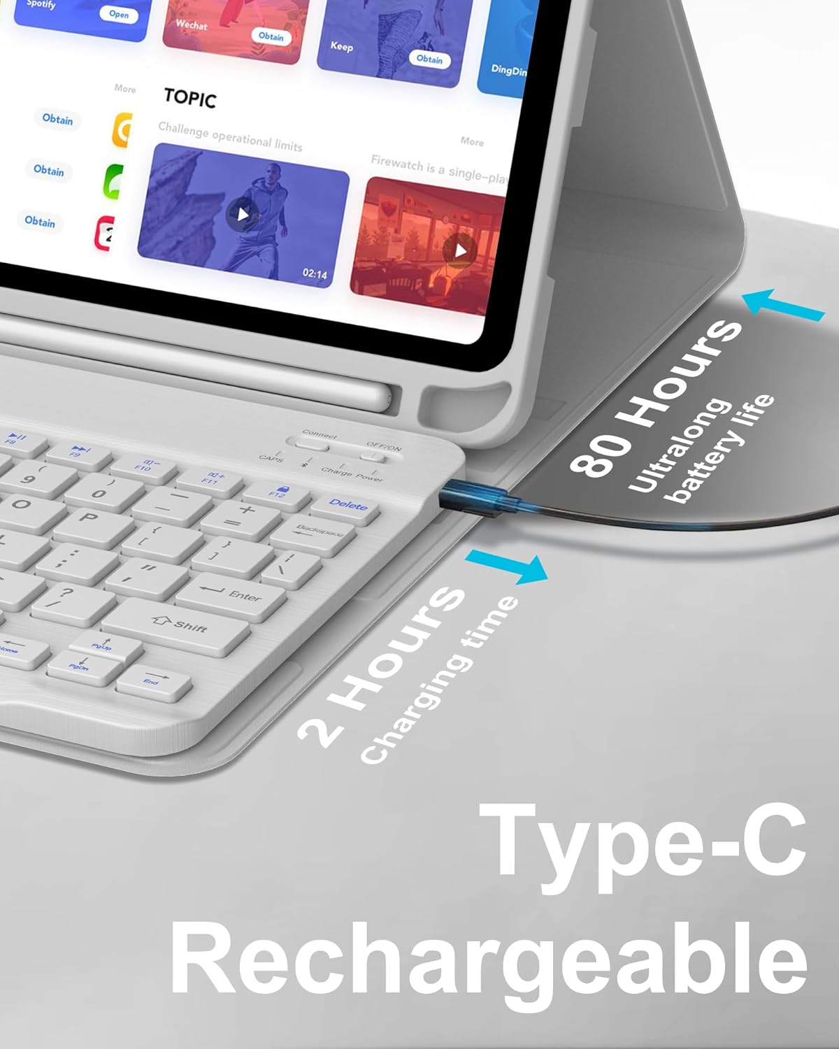 - 【Long Life Battery & Magnetic Detachable Keyboard with Shortcut Keys】 The ipad keyboard 10th generation adopts the more general type-c interface, charging for 2-3 hours, and can work continuously for up to 70 hours under normal use. The iPad 10th generation case with keyboard features a full row of shortcut keys for one-tap access to popular functions including volume and media controls, brightness levels, and more.