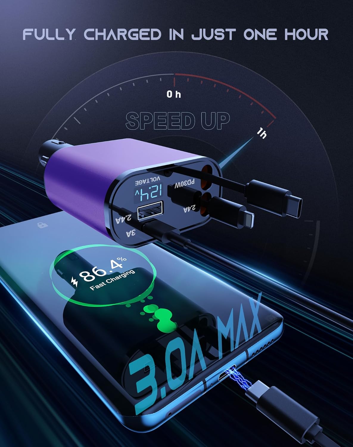 - SAFE SMART CHIPS & REAL-TIME VOLTAGE MONITOR - Safety is always our top priority! Our car USB charger is engineered with advanced smart chips that protect against overcharging, overcurrent, overheating, and short circuits. Also provides a voltage monitor, allowing you to monitor your car's battery health in real-time, ensuring optimal battery performance and longevity for both your car and phone. AND this retractable car charger only starts charging when the car is started